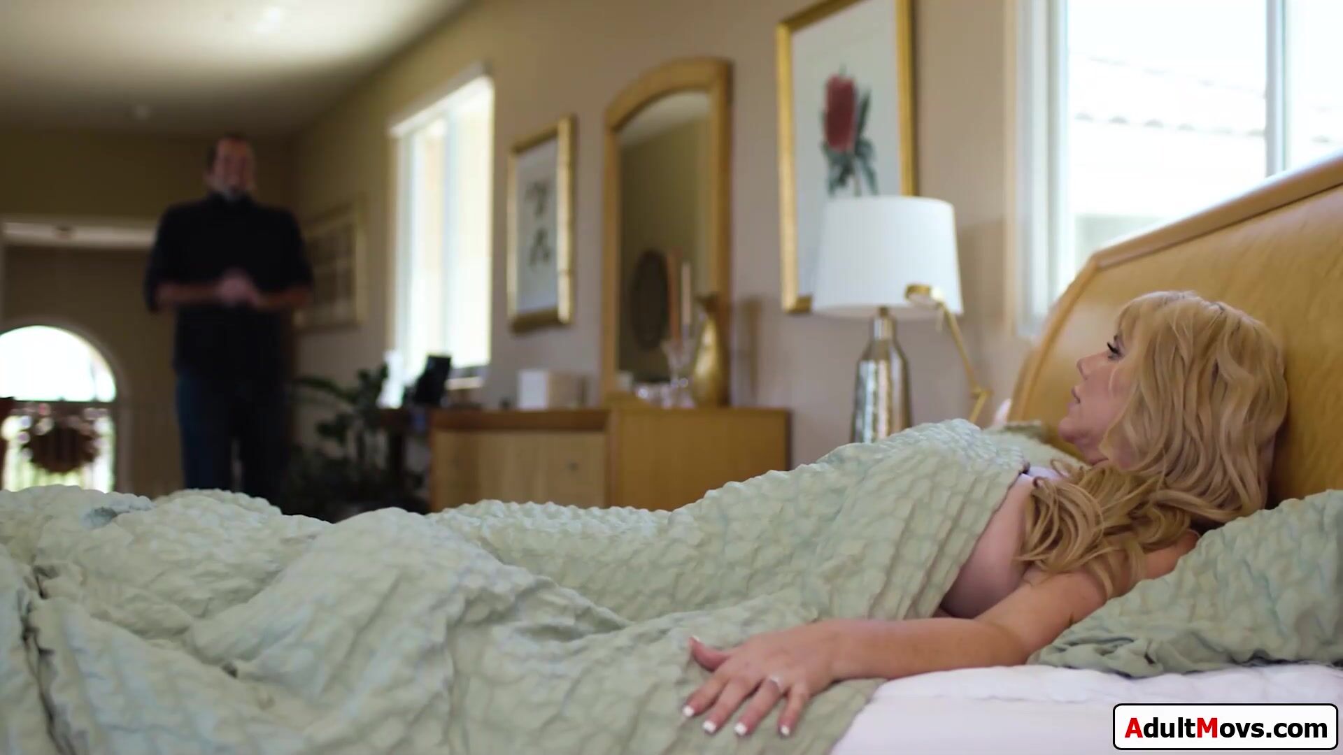 Chubby big boobs mature stepmom cheat with her stepson who is licking her pussy under the sheets when her husband walks in.The moment hes gone she deepthroats his big cock.All hard and horny he bangs the blonde busty cougar and she rides dick