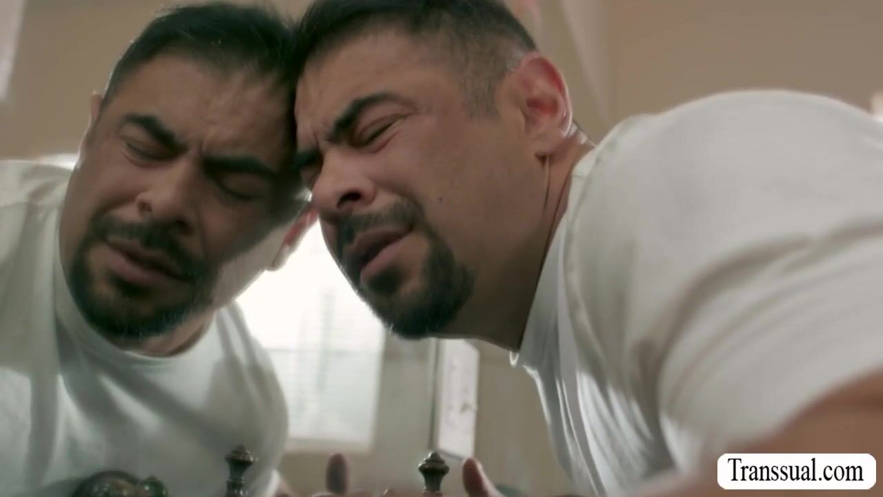 Pervert fat saw TS redhead inside the bathroom jerking off her shecock.Instead of getting mad,she lets him come in and lets him suck her hard tranny cock passionately.In return,she licks his ass first to makes it wet before she fucks it so hard.