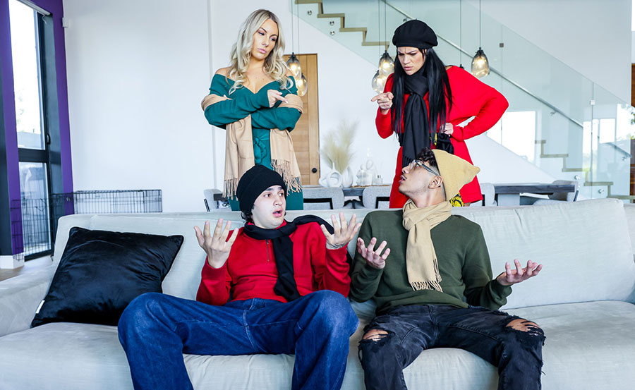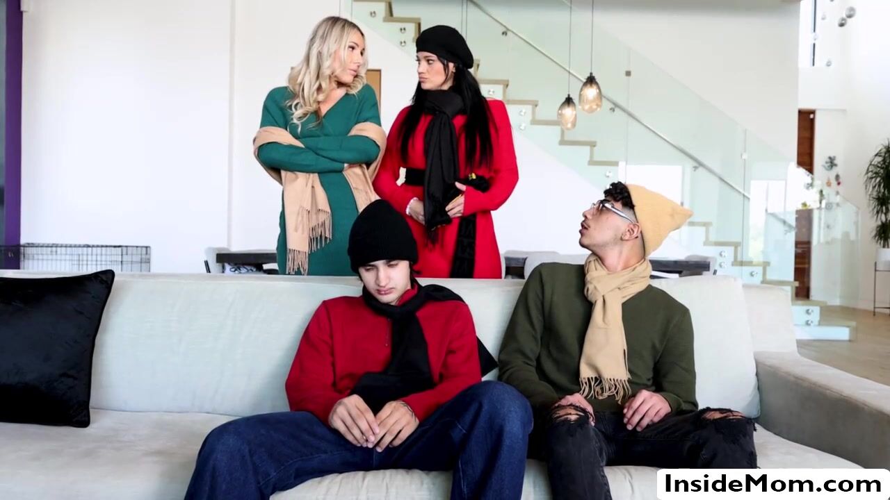 Milf stepmoms Bunny Madison and Mona Azar are concerned about the well being of their stepsons, Diego and Ellias. The two babes comfort them with heated foursome sex in the couch together they blowjob their bigcocks before getting their pussies fucked.