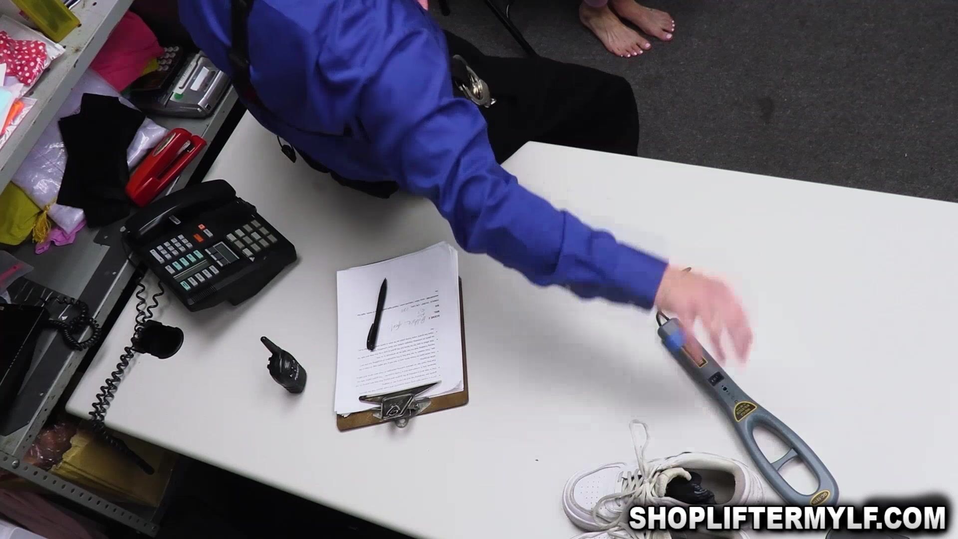 Security officer Jack brings suspected thief Barbie to the backroom for questioning after shes caught stealing some electronics Officer Jack then gives her the option to walk free but first she’ gonna have to show him how sorry she is for stealing