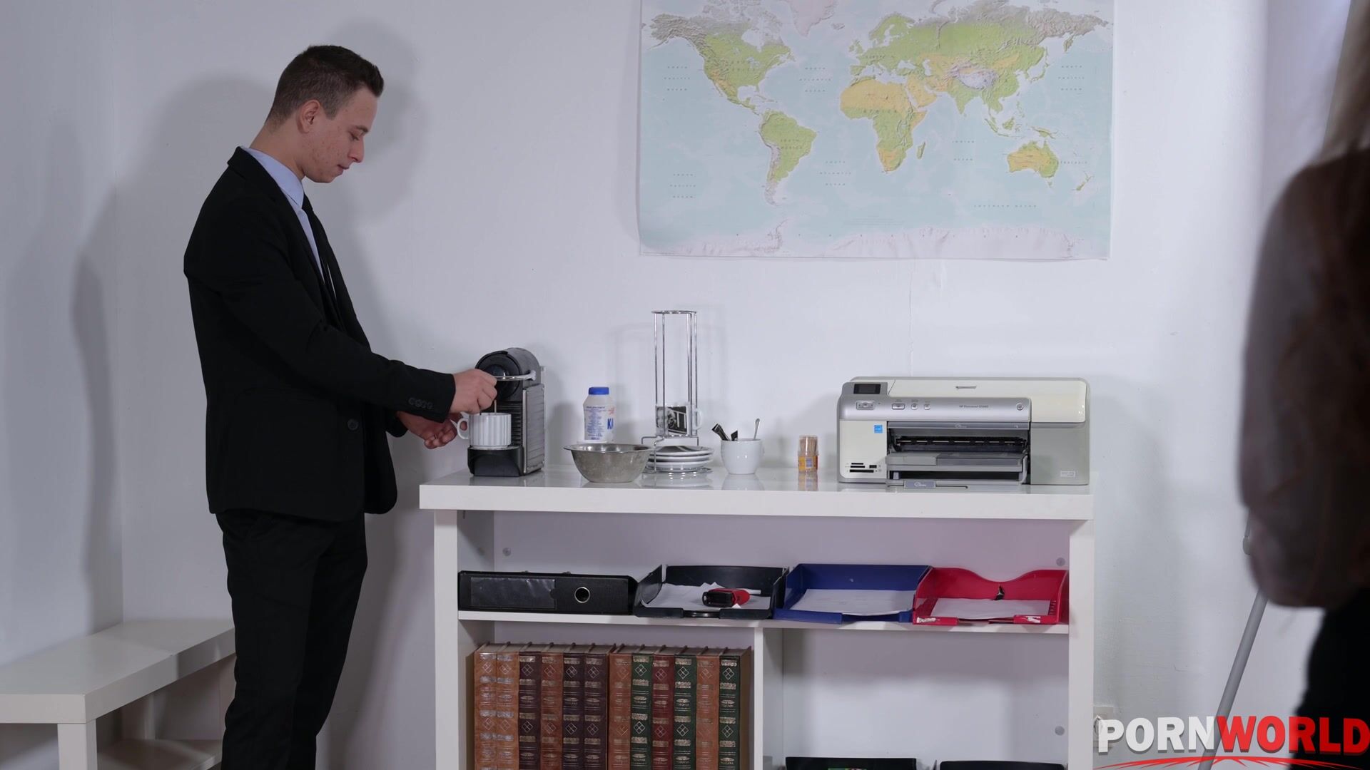 During a coffee break at the office, a young male professional who’s relatively new to the job is quickly seduced by his older, more experienced, horny boss. After taking the young stud's cock in all areas of the office, the MILF boss swallows his cum for lunch.