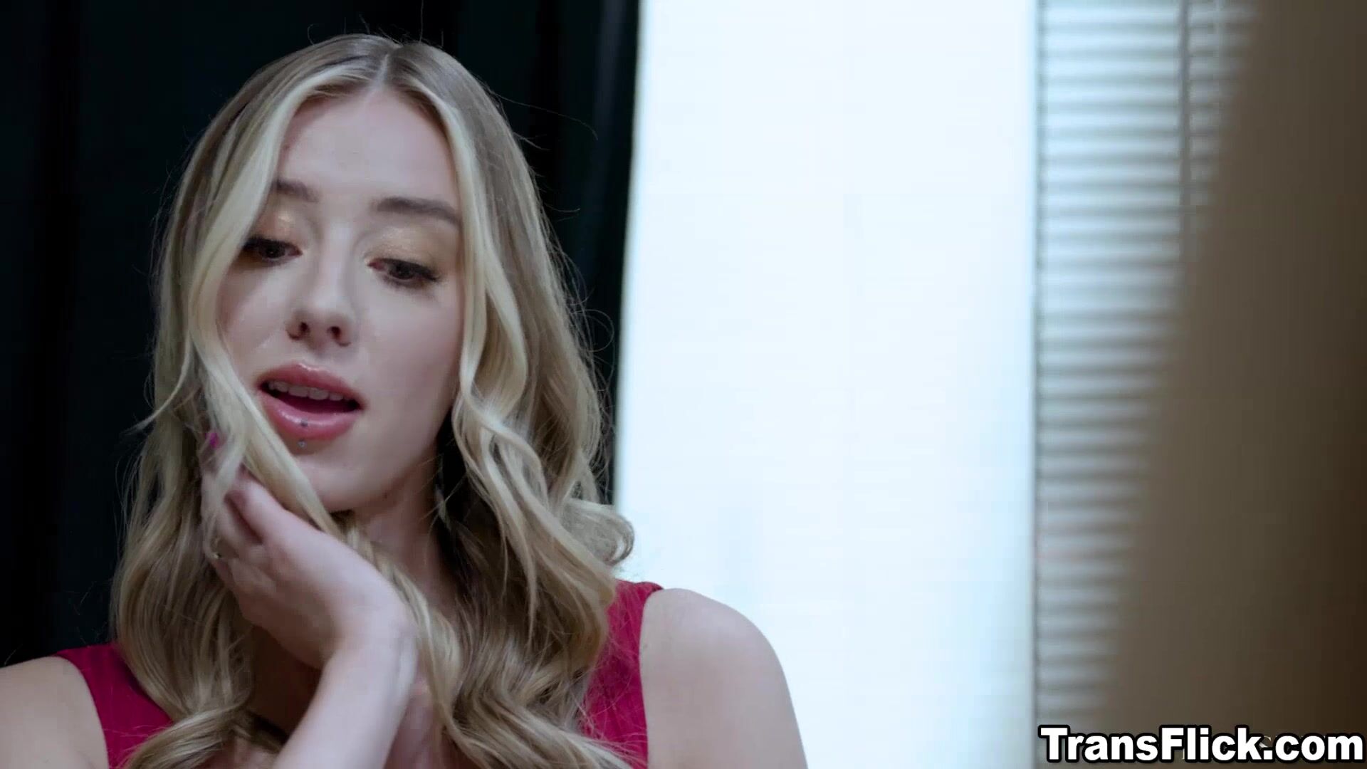 Gracie Jane and Haley Reed, sit in chairs facing each other as they wait their conversation quickly turns to blatant flirting. Gracie uncrosses her legs, giving Haley an upskirt peek and revealing that she's not wearing panties. It's clear there's ONE thing on both of their minds is sex