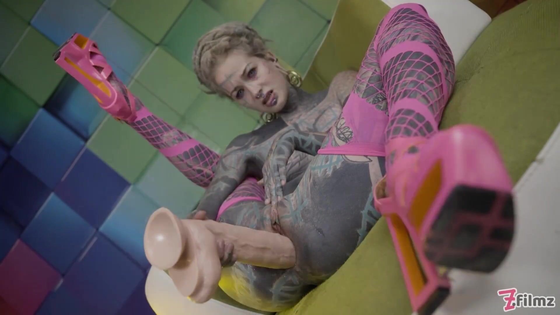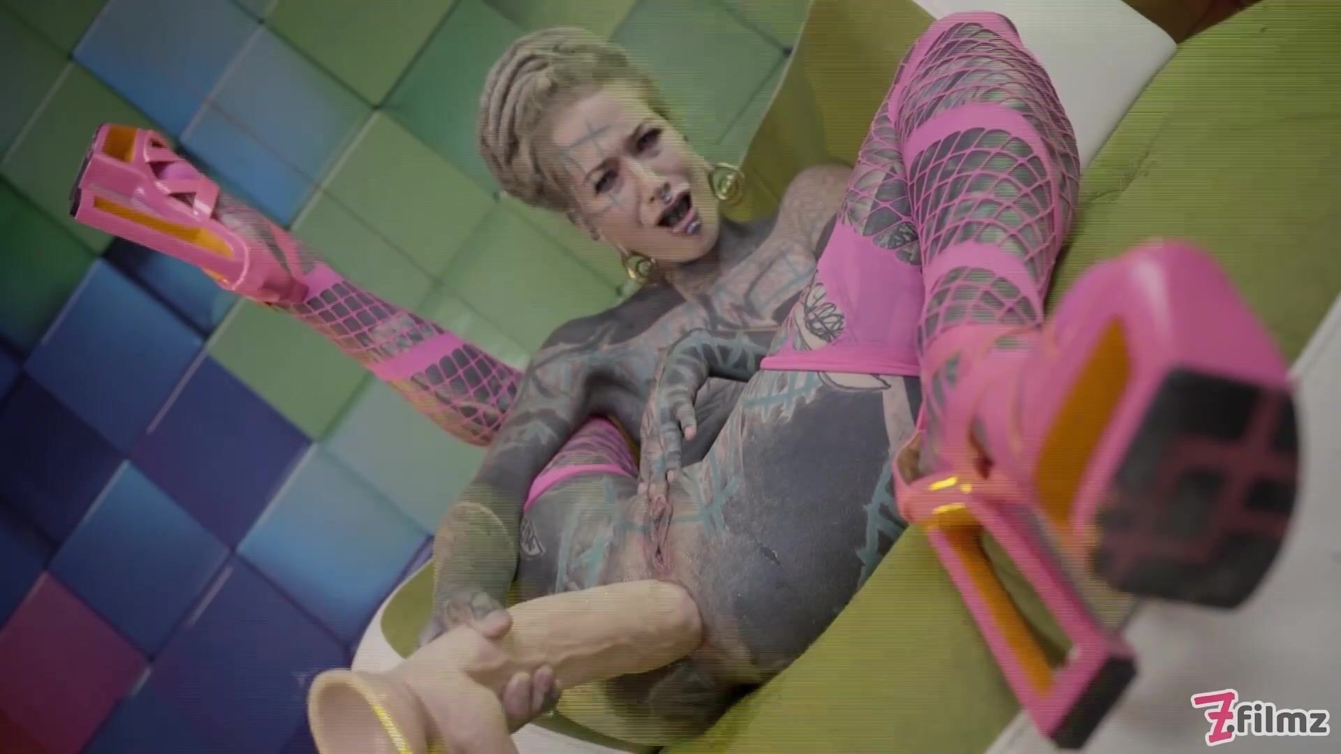 Heavily tattooed Anuskatzz stretches her ass