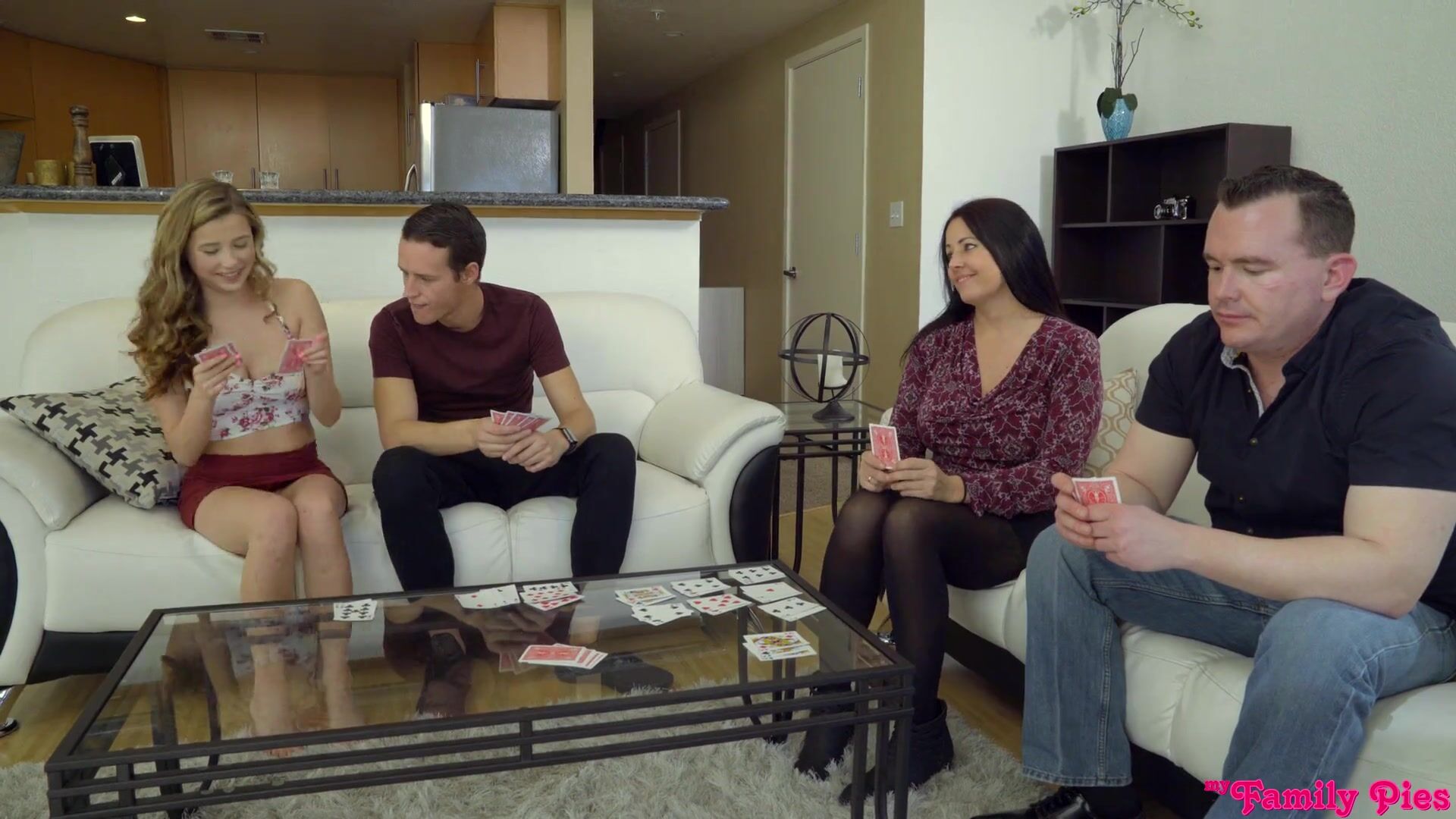 Description: Carolina Sweets and her stepbrother Justin Hunt are playing a variant of Go Fish called Pull Out. The kids flirt while their parents are distracted, with Caroline pulling out her tits and Justin admiring his stepsister's legs beneath her miniskirt. When Caroline lifts her short skirt to show Justin that she's not wearing any underwear and that her bald snatch is wet and ready, Justin feels himself getting hard. Caroline feels it too as she reaches over to stroke his dick through his pants. Eventually the game ends, and Carolina and Justin wait until their parents leave the room. As soon as they're out of sight, Carolina drops to her knees on the couch and whips out Justin's hard cock so she can suck and stroke it. She loves her stepbrother's big dick, and boy does he like admiring Carolina's tits as she works magic with her mouth. Hiking up her miniskirt, Carolina climbs into Justin's lap and slides down until his hardon is seated balls deep in her creamy twat. Though her stiffie ride feels incredible, Carolina wants a deeper kind of penetration so she gets on her hands and knees to let Justin pound her pussy doggy style. Taking care to stifle the sounds of her climax as she cums and then flips onto her back to orgasm again, Carolina takes Justin for everything he can give her. As he reaches the limit of his endurance and pulls out to cover his stepsister in a shower of jizz, Justin also remains as quiet as possible to prevent their parents from suspecting what the stepsiblings are up to.