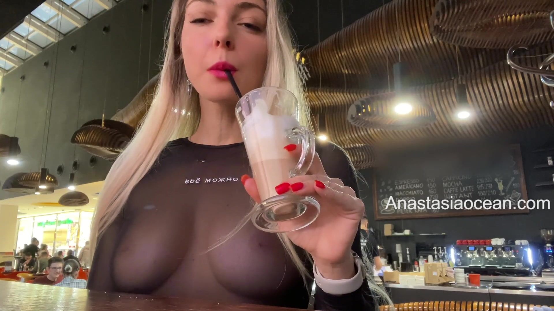 Anastasia Ocean - Public - Sexy blonde flashes her big natural tits in a crowded cafe.