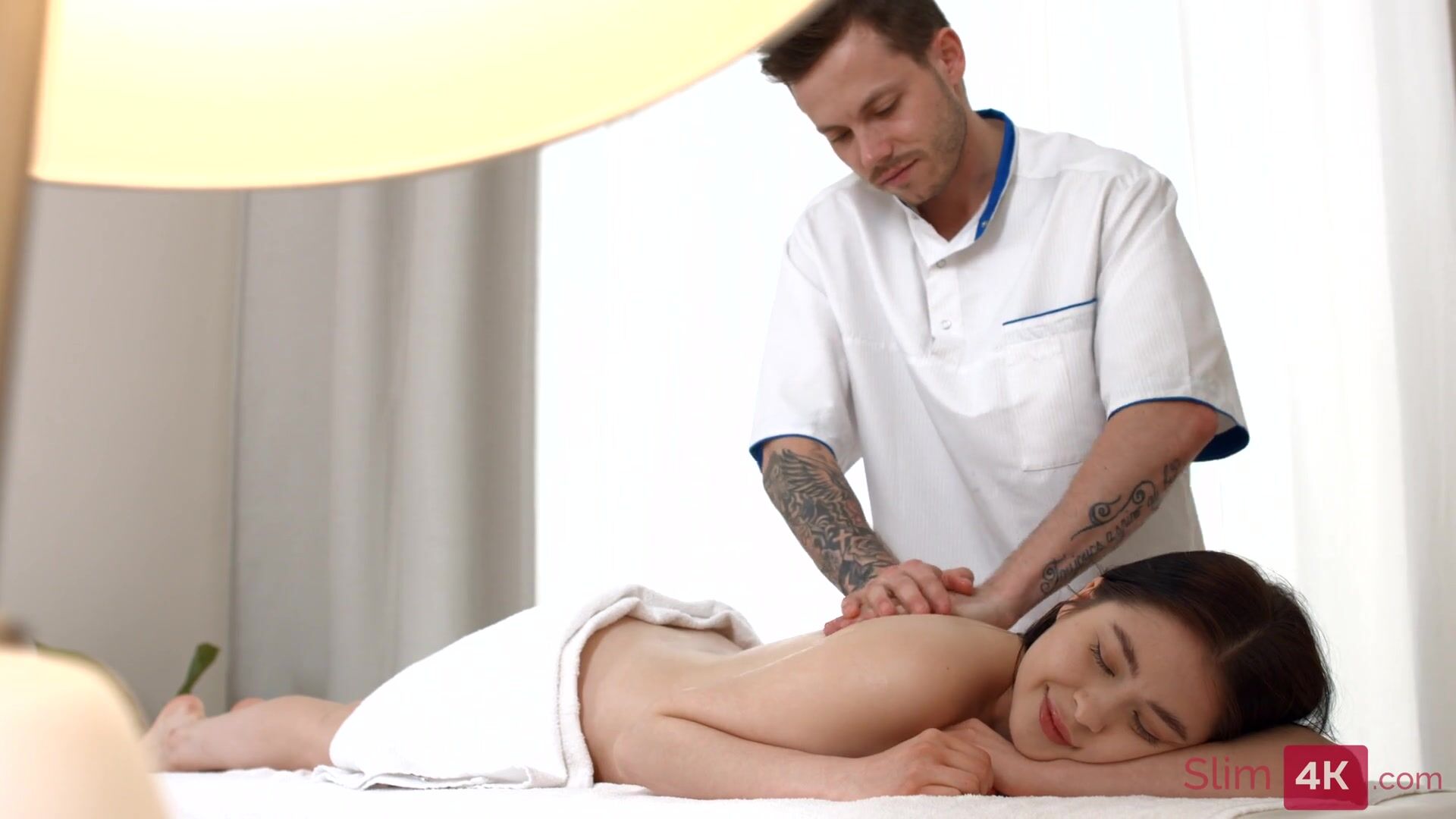 Inked masseur lays out necessary materials on the table to show he is ready for his next client. Adorable brunette arrives and after a little hesitation she gladly peels off all her clothes. Stud starts rubbing her amazing body making minx smile with pleasure. Excited gal turns around showing guy she doesn't mind if he touches her big clit. Guy licks sweet pussy before babe returns the favour with a proper cock sucking. They have ardent lovemaking on the table that ends with unforgettable creampie.
