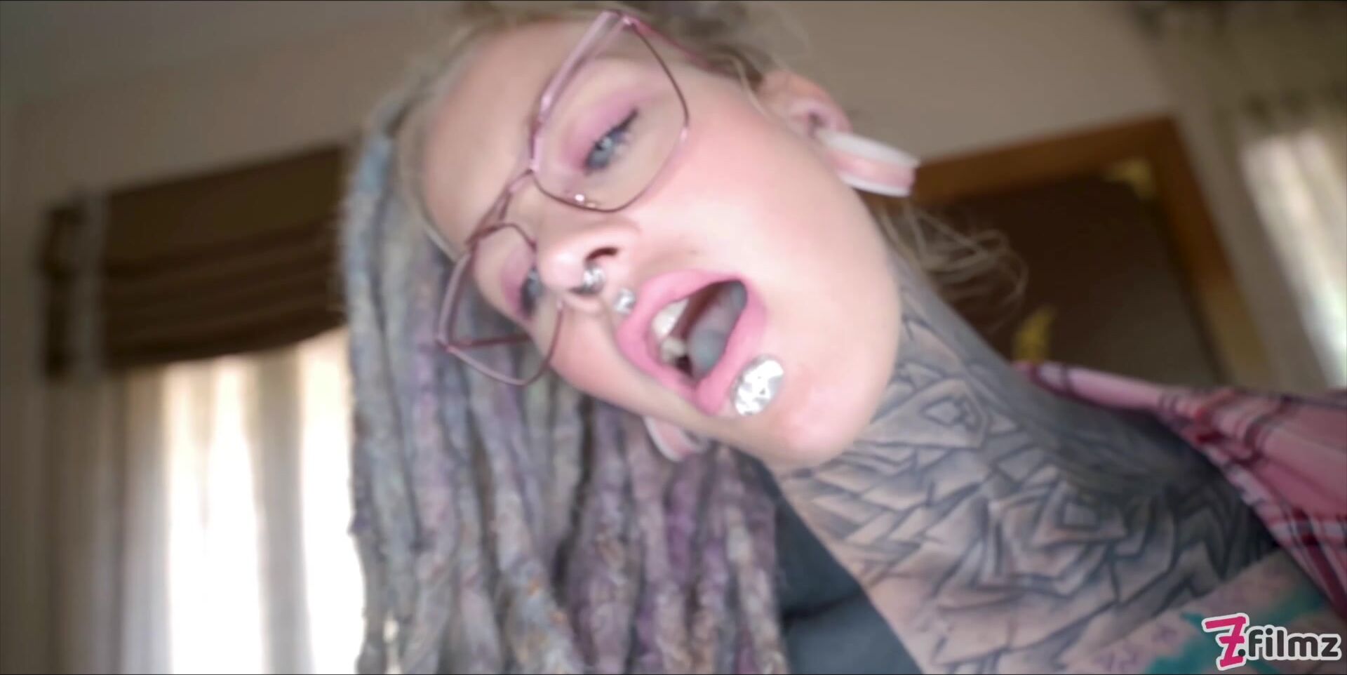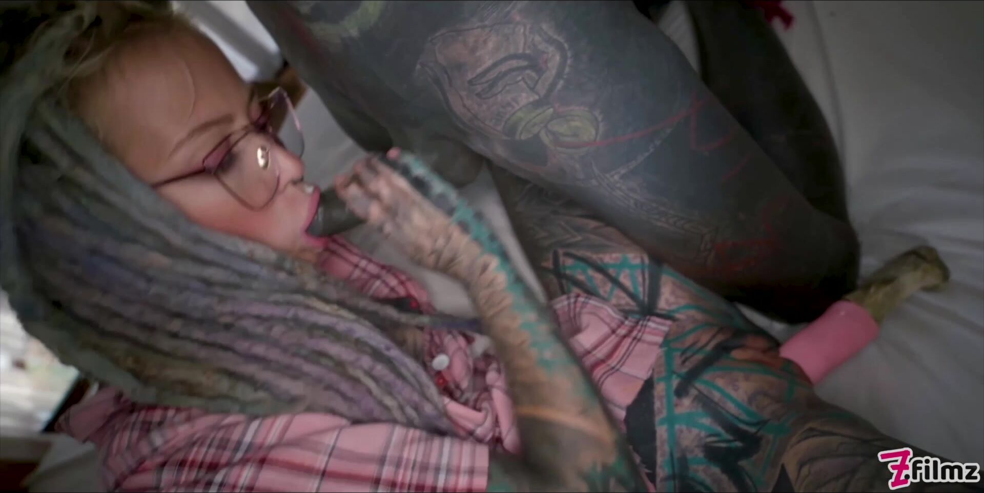 Heavily tattooed Anuskatzz gets crazy naughty and horny wearing glasses. She gapes for him and gets banged in multiple positions!