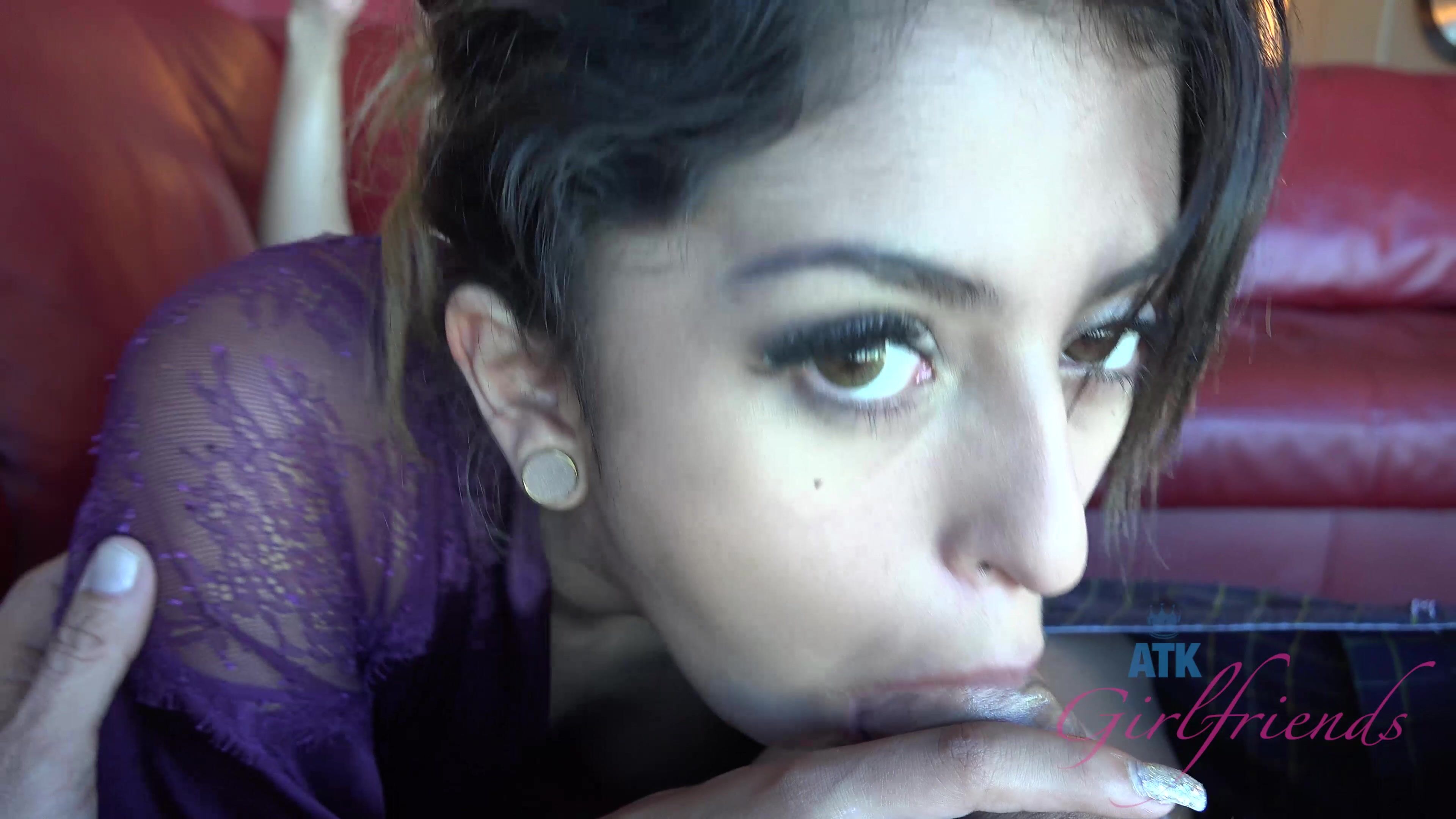 Sophia looks lovely in her purple silky bathrobe. As she's smiling her beautiful feet are rubbing your pajamas. It doesn't take you long to get hard, or for her to start sucking your cock. Her beautiful soles are visible in the background. Her pussy gets treated your finger and mouth. After she tastes your cock, Sophia's hairy pussy gets penetrated. You love hearing her moans and watching her eyes roll as your cock stuffs her tight pussy. She finally asks for your cum inside of her. Since the creampie got stuck deep inside, your finger goes in to scoop it out.