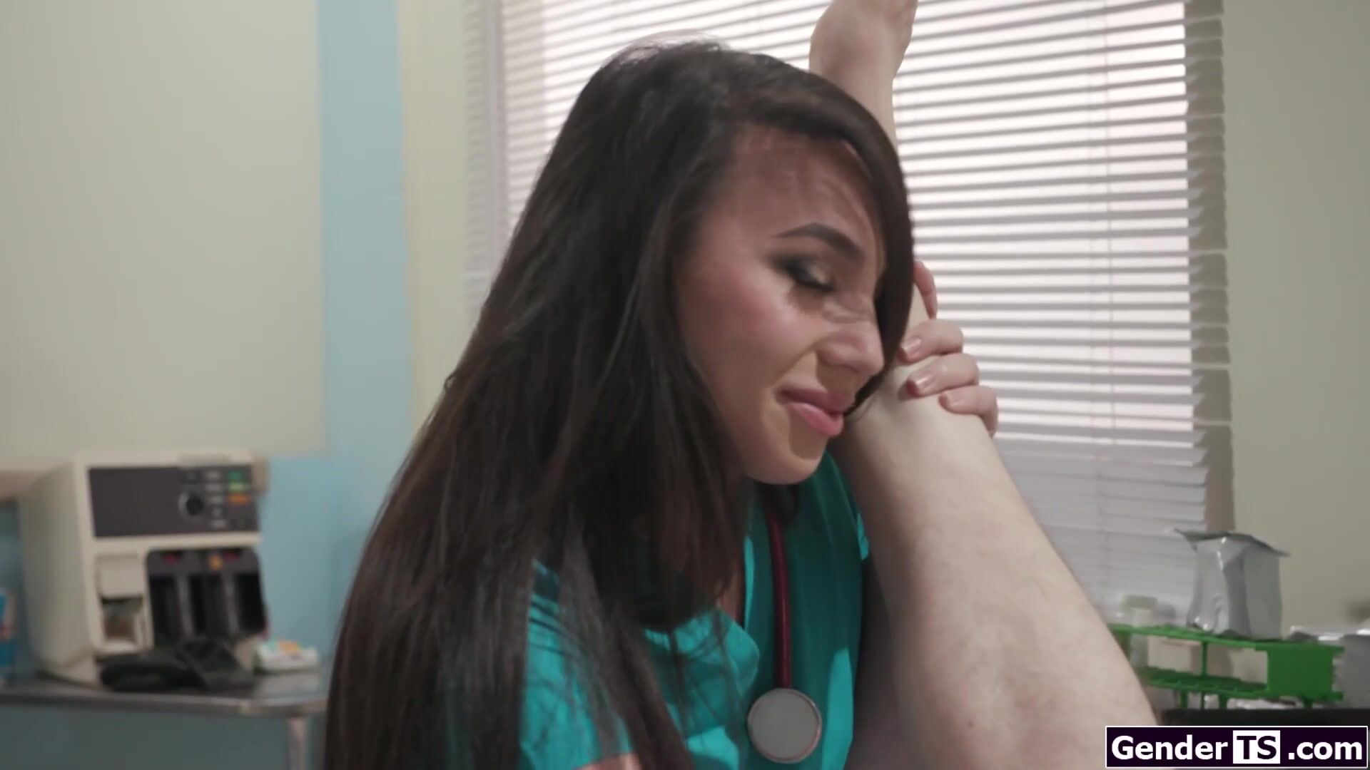 Asian shemale nurse Kasey Kei has the hots for her flirty patient.The small tits tgirl kisses him.The trans gives a double handjob and deepthroats his big hard cock.The guy rims the brunette trannys ass before she bareback anal rides his dick