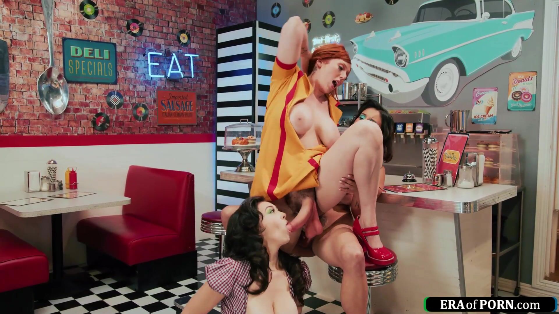 Busty big cock futa babes fuck in diner