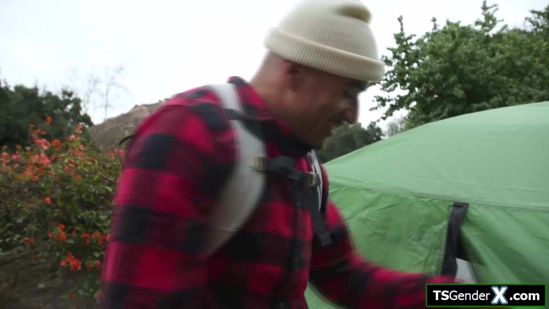 Big tits Asian tgirl Ember Fiera is all alone with her date in a tent while its raining.The busty shemale is horny and gets her trans cock sucked.The brunette tranny deepthroats his big black cock and enjoys the feeling of a bbc anal barebacking her