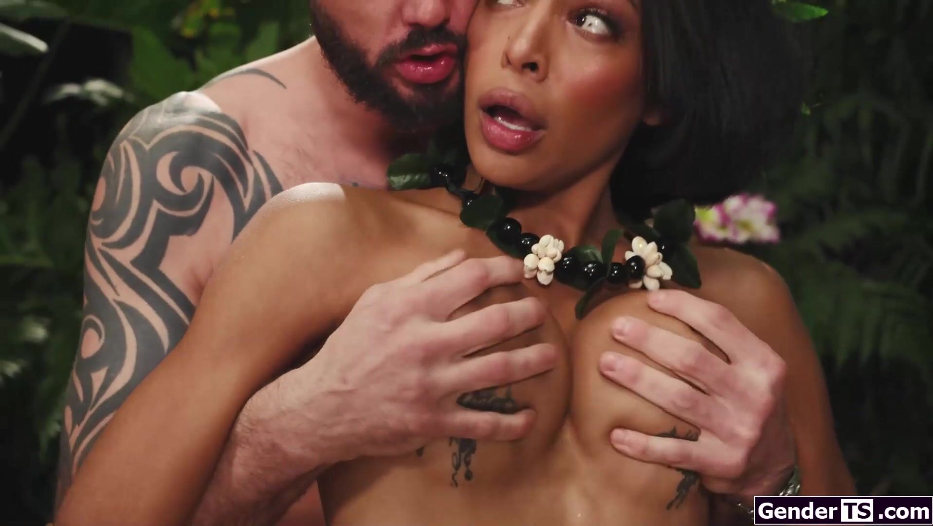 Guy stumbles upon horny latin hulu warrior tgirl Lola Morena.The big boobs shemale deepthroats the guys dick and gets her ass fingered while having her trans cock sucked off.All hard the big tits tattooed tranny bareback anal rides on his big boner