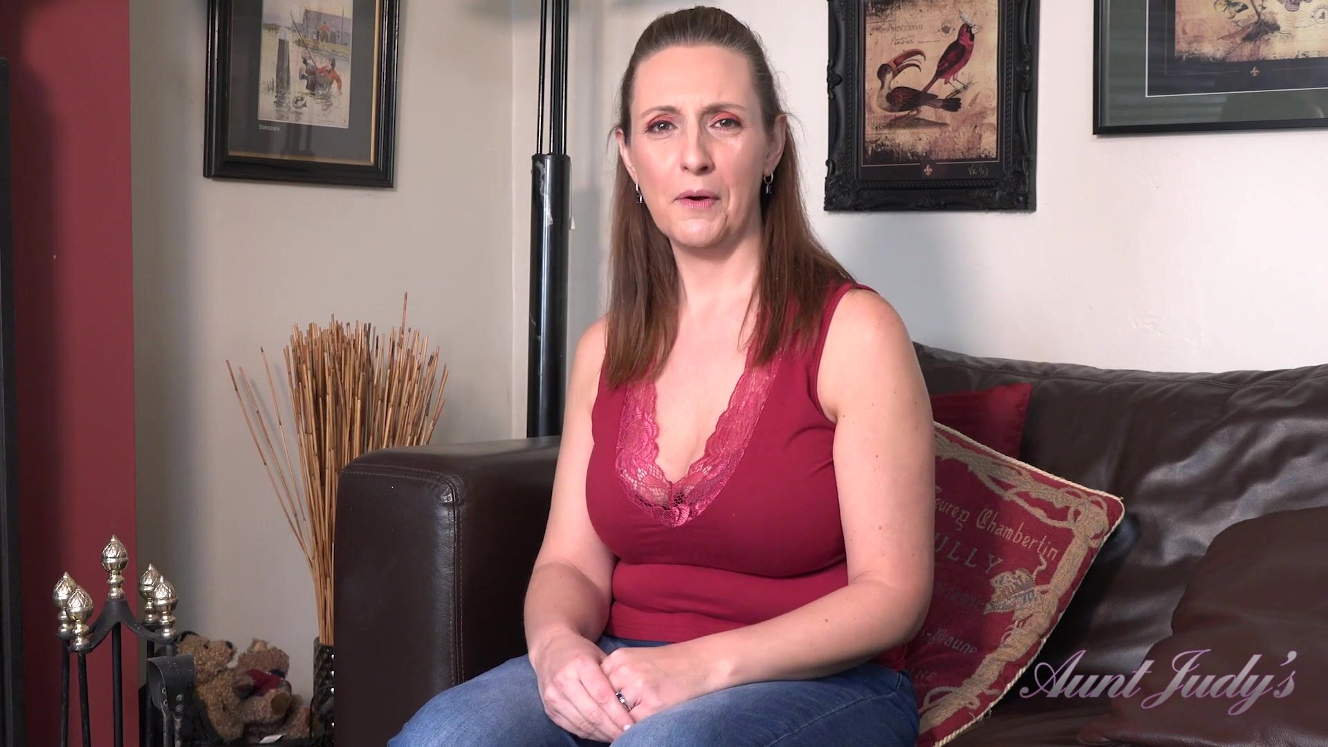 So you've popped by to see your hot redhead MILF step-Auntie Keira, and she's delighted to see you. Sitting across from you on the couch in a low-cut sleeveless top for maximum cleavage, and tight blue jeans, she gets the usual catch-up questions out of the way before asking about your dating life and is delighted but surprised to find you've got a keen lust for women her age, and can't help notice that bulge growing in your pants. Deciding to have a little fun, she slowly pulls off her top to reveal her maroon bra and ample cleavage, encouraging you to take out your big, hard cock to stroke it for her. After peeling off her blue jeans to reveal her lacy light blue panties, she continues instructing you on exactly how she wants you to stroke your cock while taking out her big natural MILF tits to play with, then sliding off her panties as well. Lying across from you and watching you stroke, she gets in on the fun by rubbing and finger fucking her shaved MILF pussy to orgasm just for you and encouraging you to bust for her.