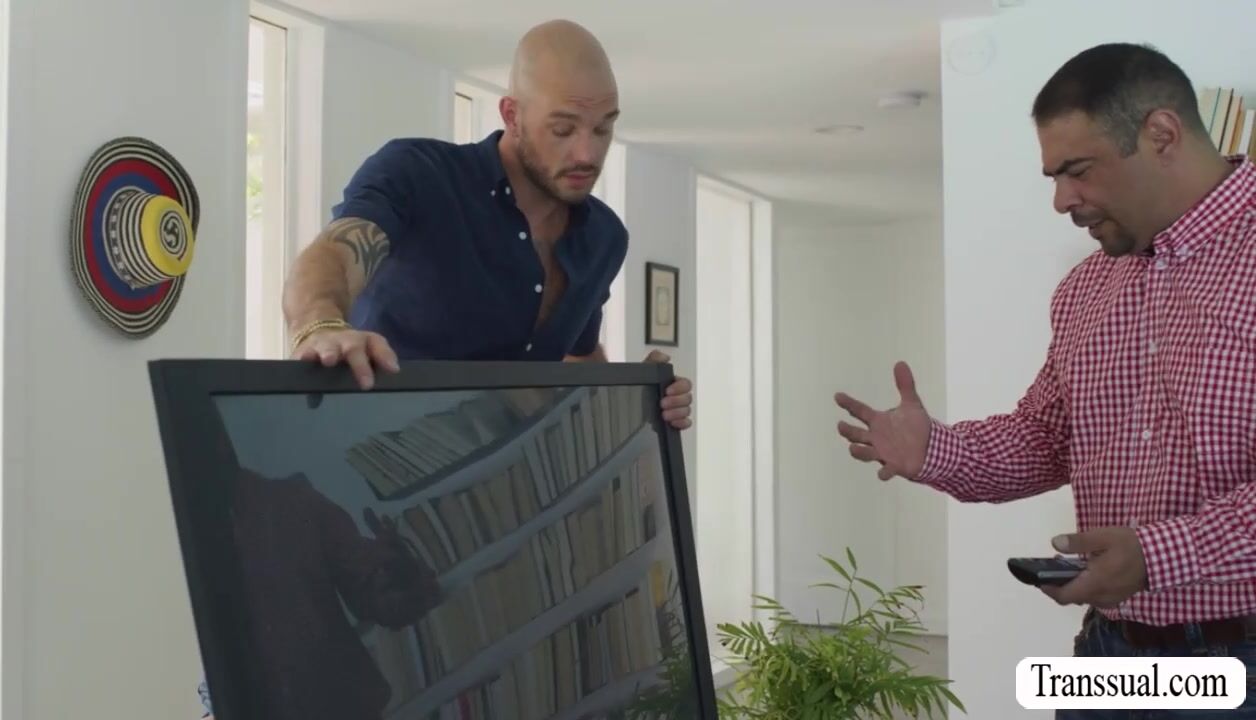 Slut shemale Eva Maxim lets her neighbor touch her big tits.After that,she throats his hard big dick while hiding back of the TV.Next is,she lets him bareback fuck her wet asshole so deep and hard.Go to Transsual.com for discount and more.