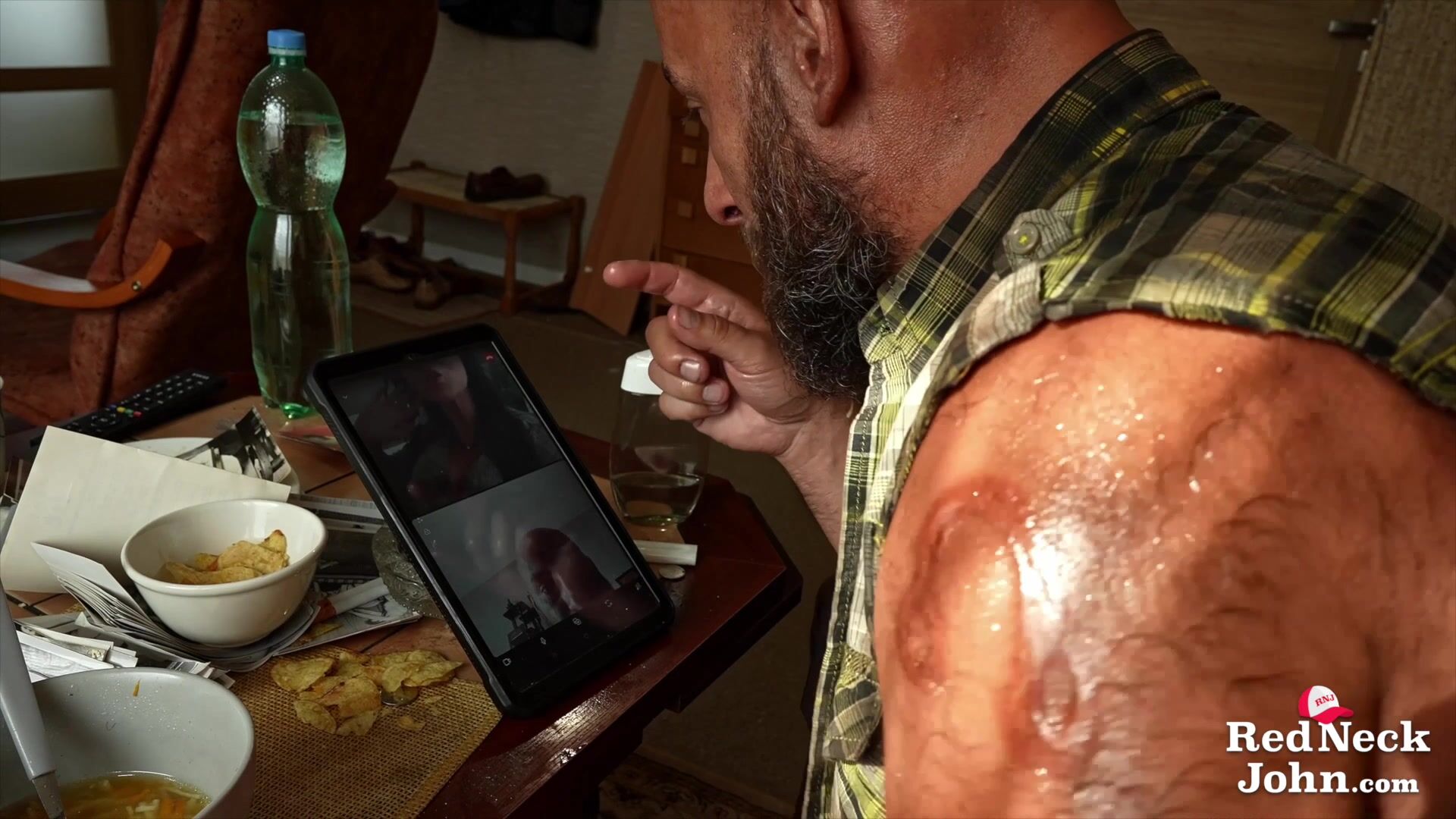 John, our favorite sweaty dude, was just minding his business—slurping hot soup and watching his favorite porn on TV—when BAM! The soup fought back, leaving him with a fresh burn and a bruised ego. But John ain't got time for whining. He wiped his mouth, scratched his belly, and did what any true country boy would—he went hunting. Not for deer. For women. He stumbled upon a fine-looking busty brunette online and decided she needed to be his. He called her up, and before he could look around, she was on her way. Being the classy gentleman he is, before she came, John did some half-assed cleaning—kicked some dirty socks under the couch, sprayed air freshener, and called it "good enough." When Sandra strutted in, John felt his excitement take his breath away. She was way out of his league, and he knew it. Massive tits and cleavage so deep he could lose his gaming controller in it—along with the last remaining bits of your sanity. His eyes were glued to her like barbecue sauce on ribs. Meanwhile, Sandra, clearly a professional, stayed cool, counted her money like a boss, and got ready to handle business.