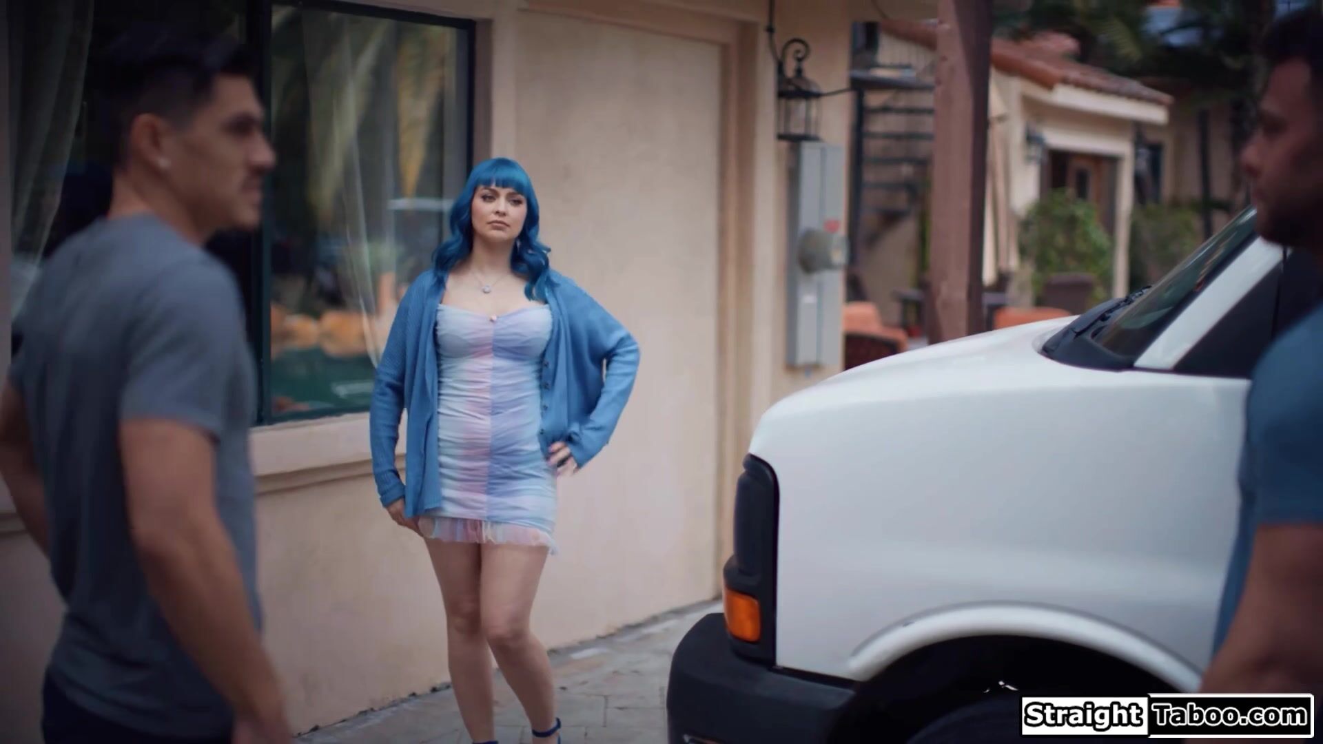 Busty babe Jewelz Blu sends her ex boyfriend out the door to have sex with his relative.The big tit blue haired beauty kisses him and deepthroats his hard cock.The guy eats out her wet shaved pussy and bangs her.He puts her on all fours to doggystyle