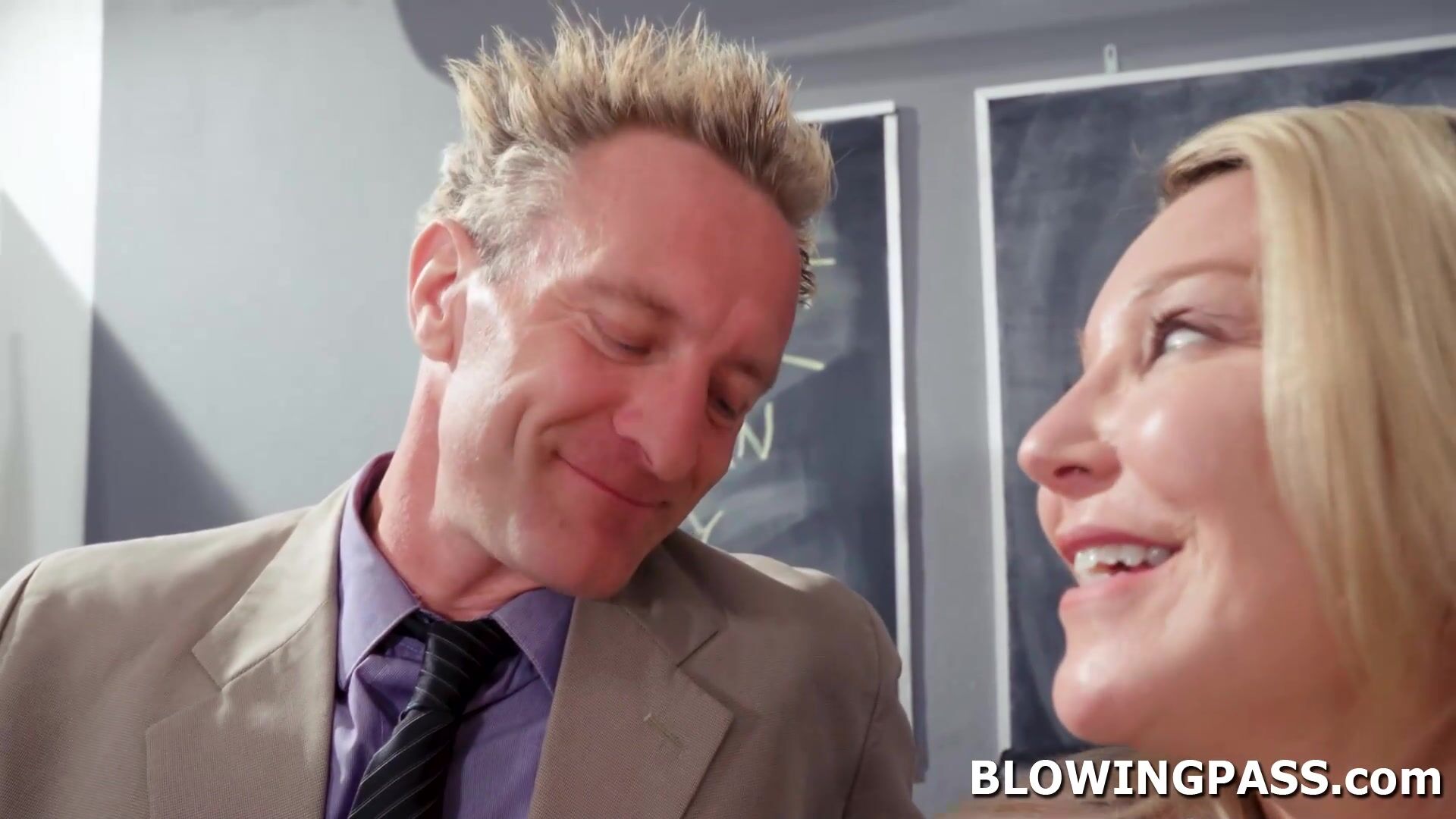 Stepmom Laura Bentley wants her stepson to graduate so she goes straight to his instructor and seduced him.The blonde milf offers blowjob in exchange for his grades.The teacher takes the deal,licks her pussy before throat fucking her on the table.