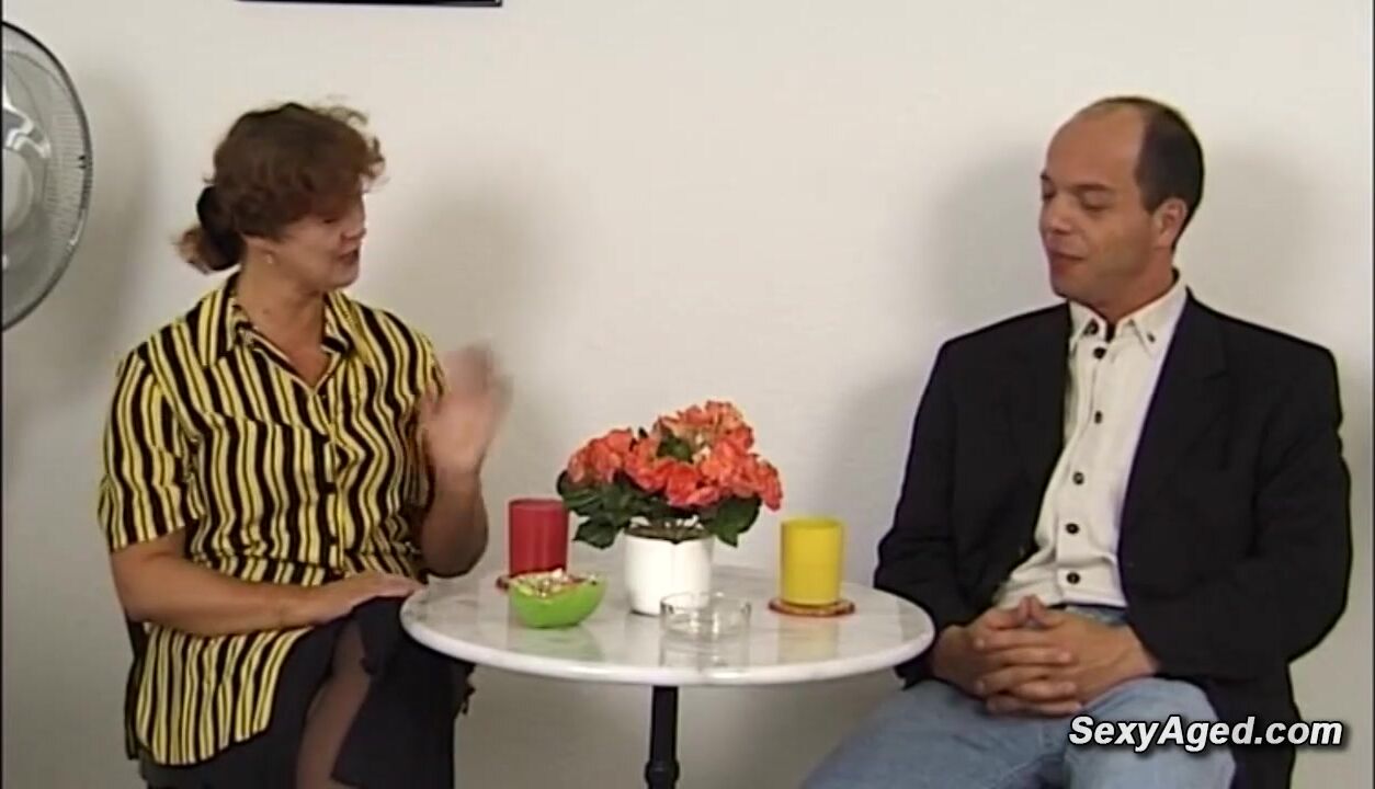 Busty amateur German mature lady Beatta jerking big cock to balding guy Gustavo Meunier while he toying her hairy pussy then he fucks her from behind in standing position