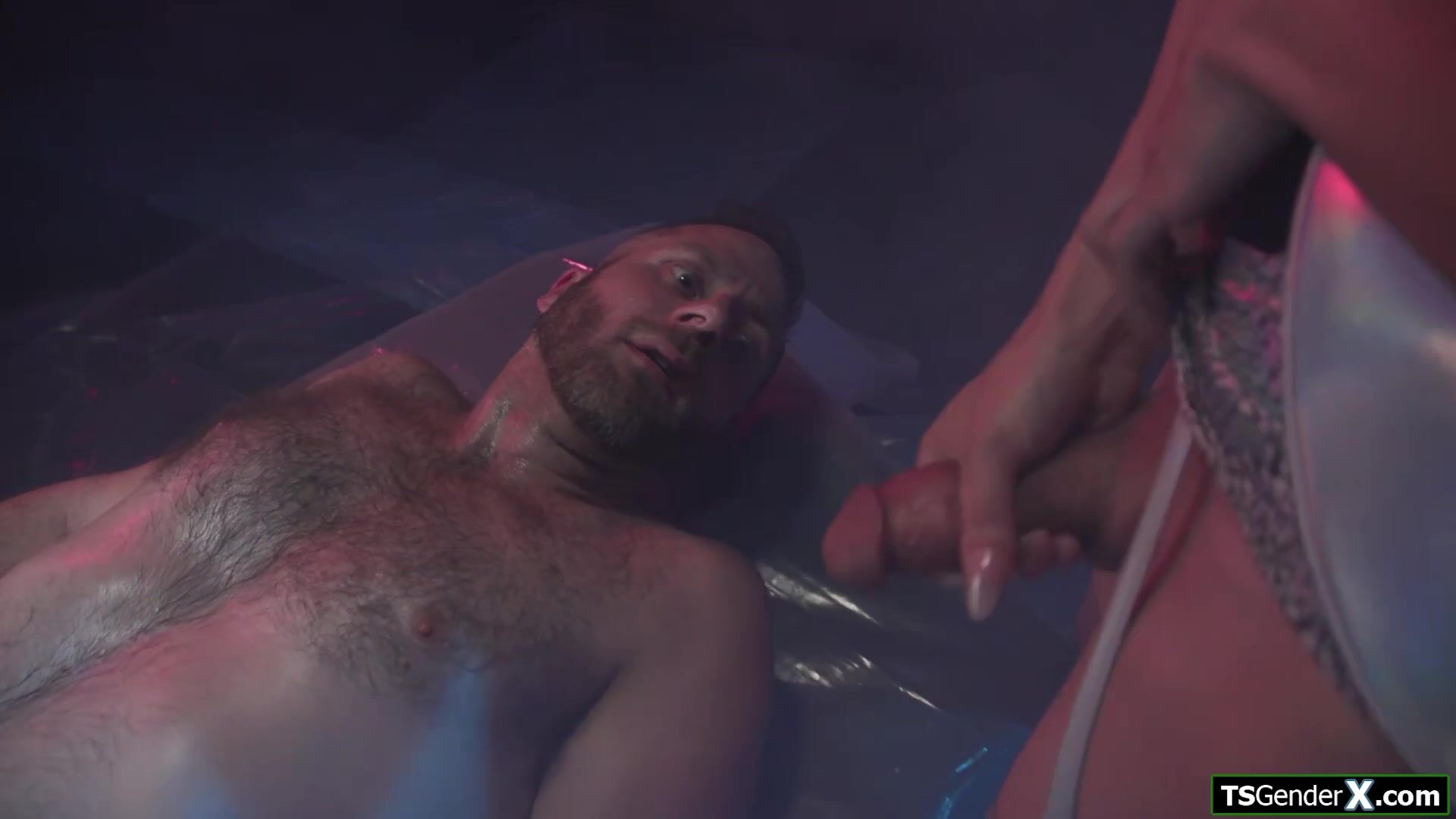Guy is naked in spacecraft when busty latin alien shemale Ariel Demure appears.The big tits tgirl is horny and deepthroats her human subjects cock.The trans facefucks him and rims his ass.All hard the the blonde big boobs tranny anal barebacks him