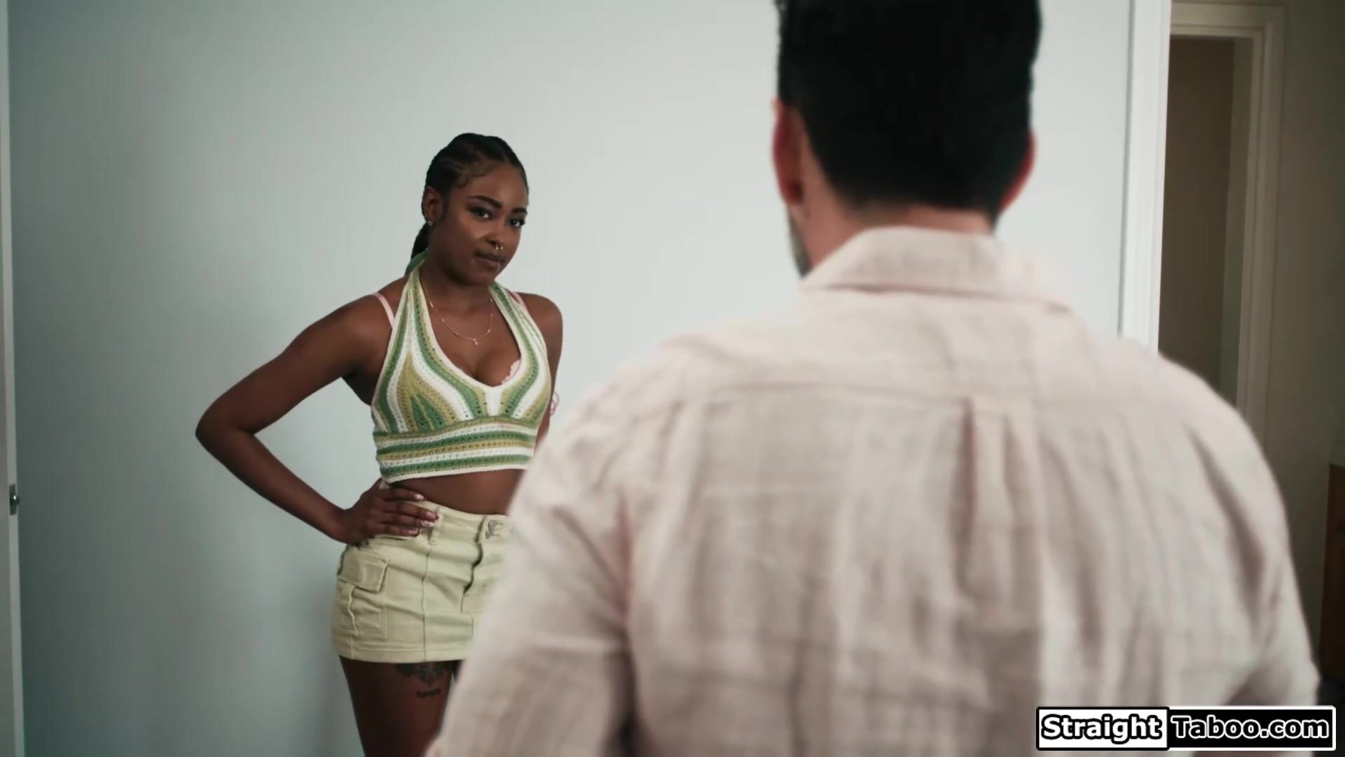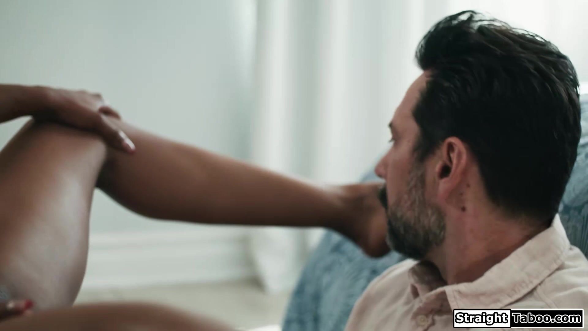 Stepdad is caught spying on his ebony stepdaughter Destiny Mira so she makes him watch her masturbate.The black babe gives her stepdaddy a footjob and gets her shaved pussy licked.The brunette deepthroats his cock and is fucked until she squirts