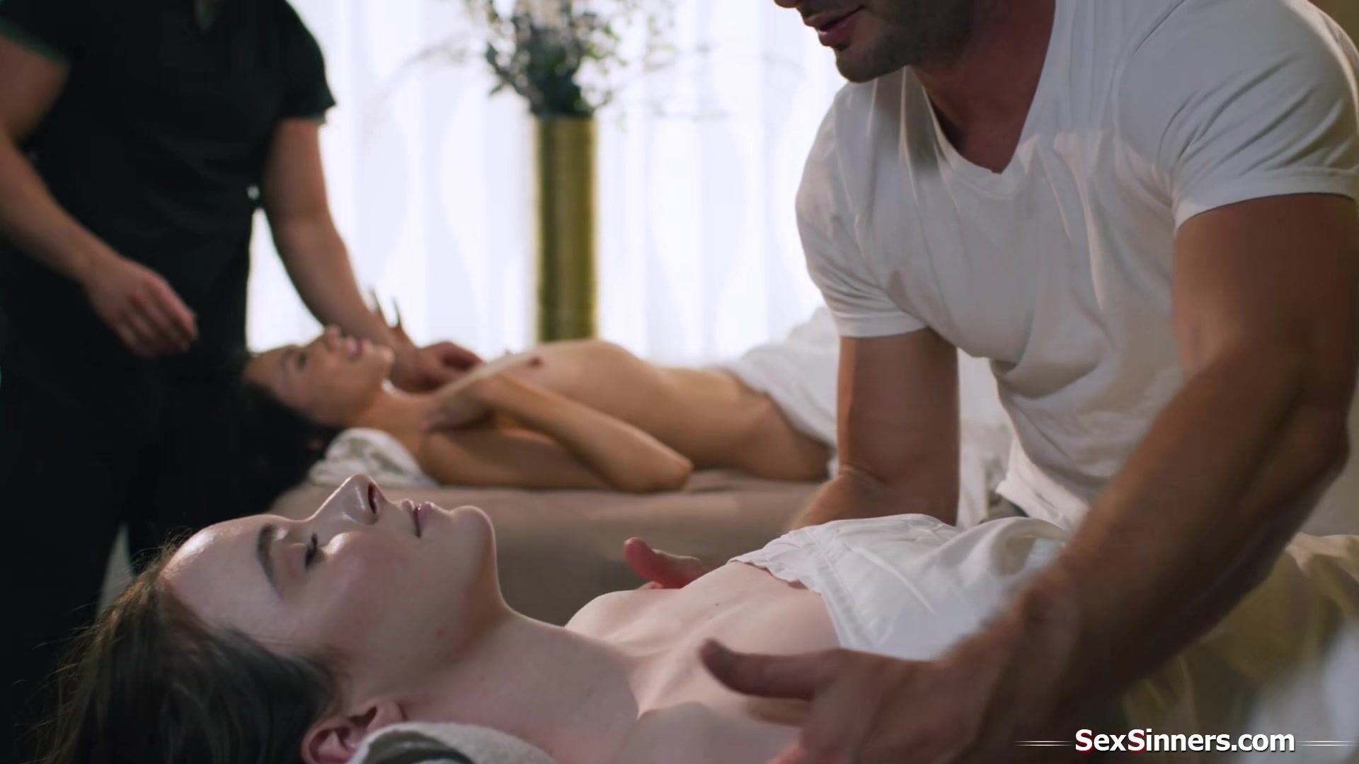 Lesbians Hime Marie and Hazel Moore have a couples massage.The horny masseurs focus on the small tits latina which they know they can fuck in secret next to her wife.While one massages the busty babe the other is sucked.They fuck and anal the brunette