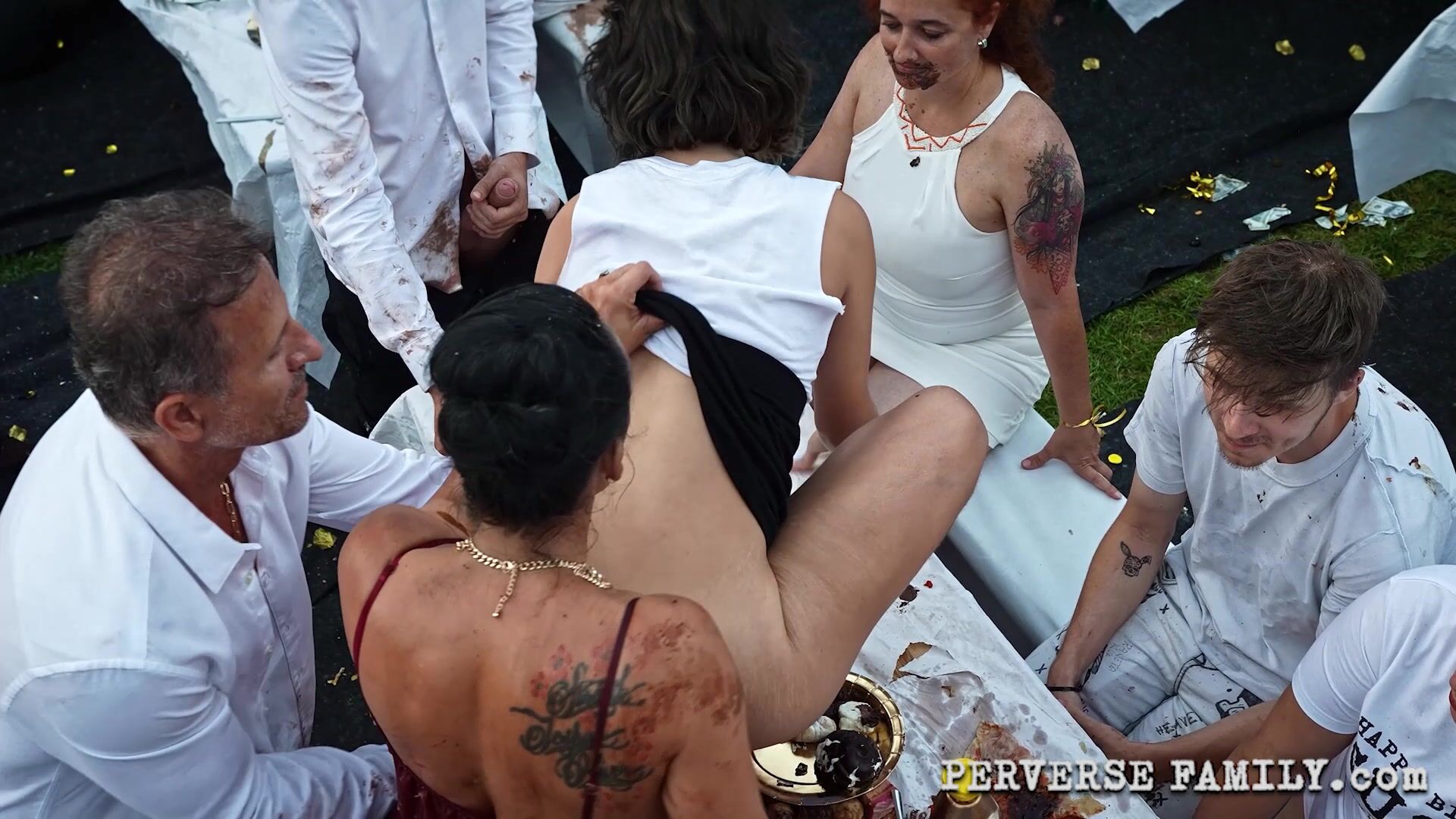Dirty perverse household is cruising between guests feeding them and fucking them with food. Two girls were served well. The petite hairy waitress got their filthy attention. She was waiting to be pulled by them into the middle of this crazy fetish orgy. They brushed her hairy cunt with a fork and covered her with food. Damien fucked her ass with his big cock. Delicious.