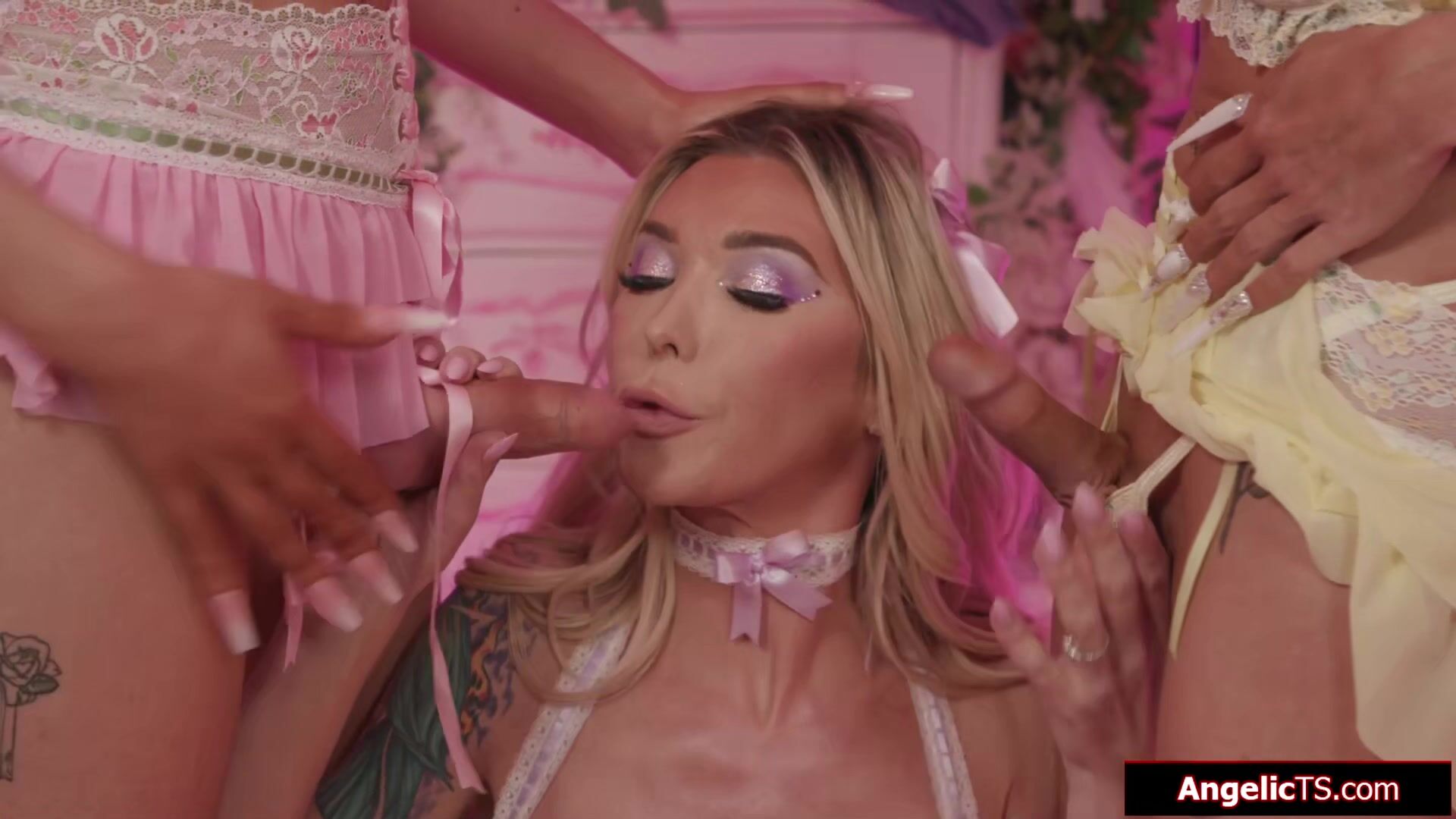 Three busty shemales Aubrey Kate,Brittney Kade and Angellica Good are horny.The big tits blonde tgirls suck each others tranny dicks and oil up.Trans Aubrey jerks off on her transsexual gfs while they bareback anal fuck and joins for a blowjob