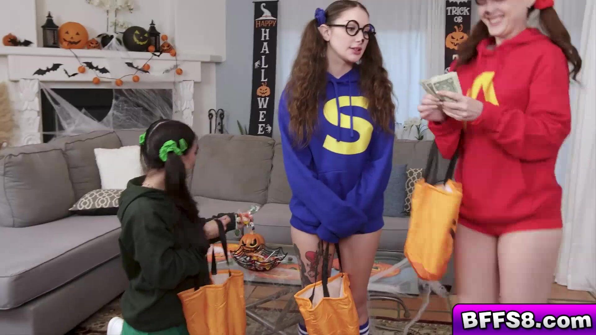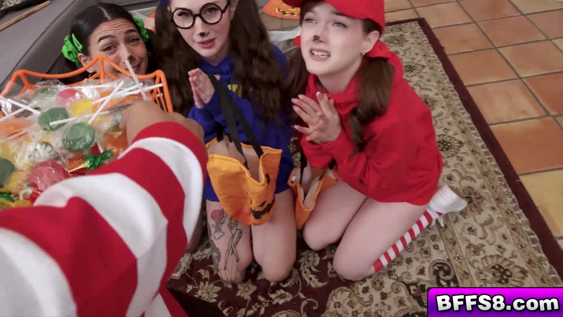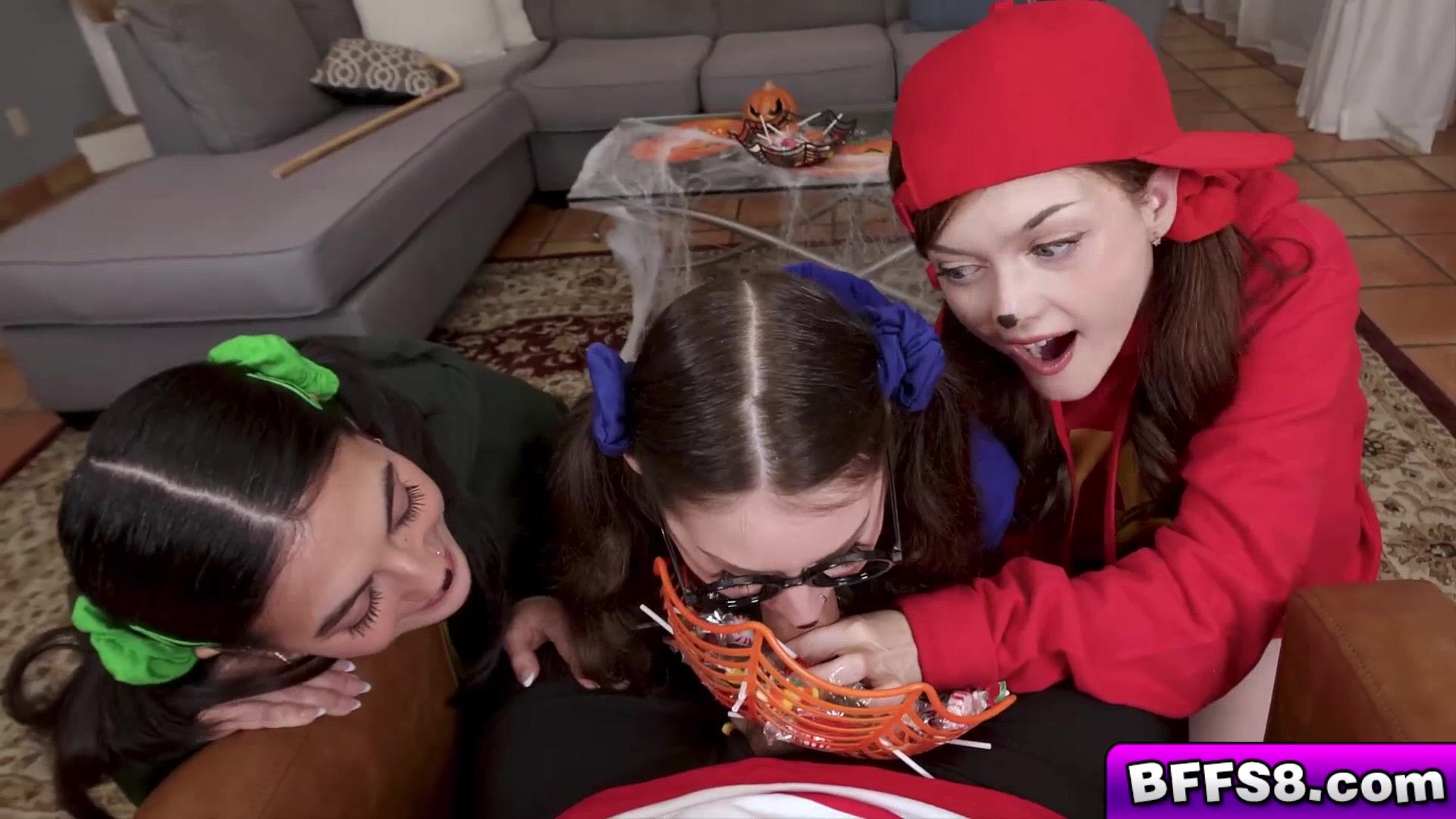 The bowl of candy he was holding was only there to hide his boner but there was no need to hide it anymore We all wanted it We took turns sucking his cock as if it were lollipop and then we rode it I cant believe his dick fit in all of our pussies