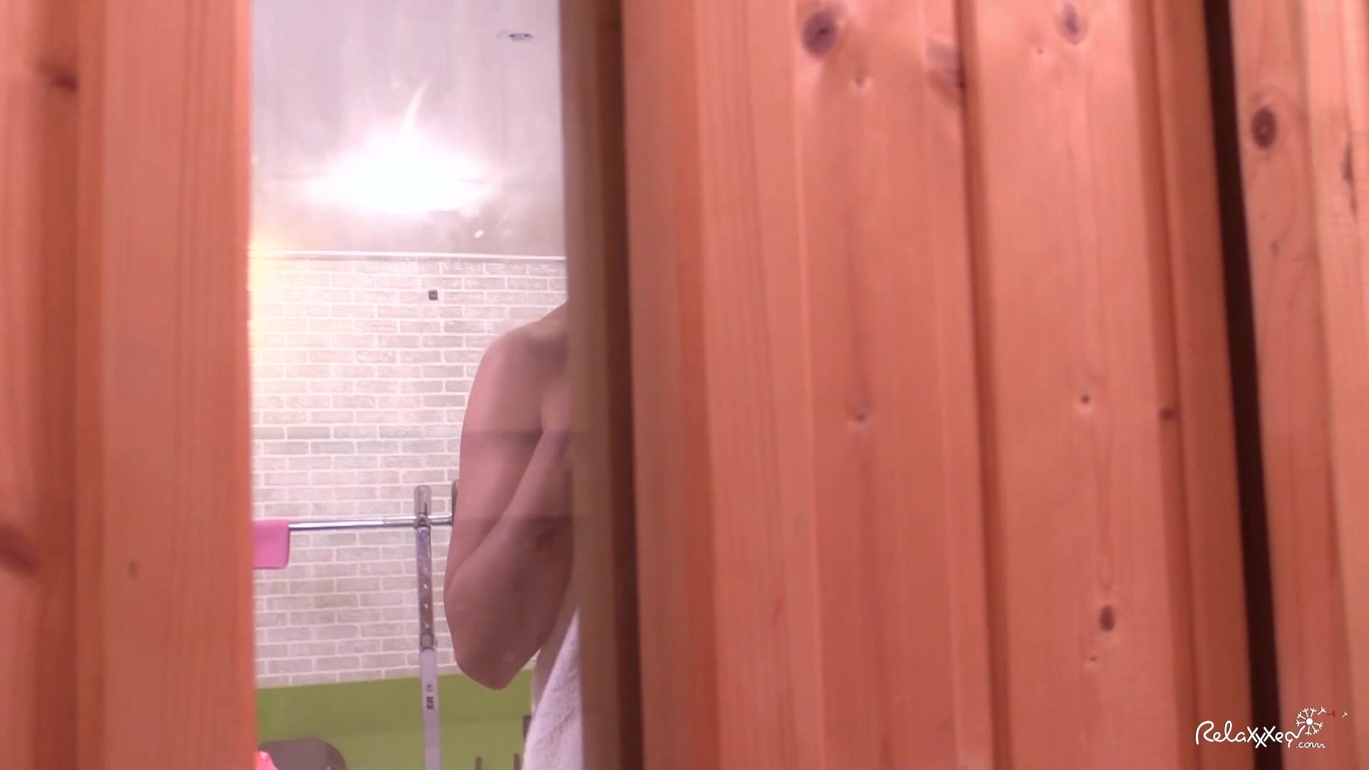 Sexy brunette with natural tits relaxes in sauna after training and fucks lucky guy in spooning and reverse cowgirl making him cum with most insane orgasm in his life!