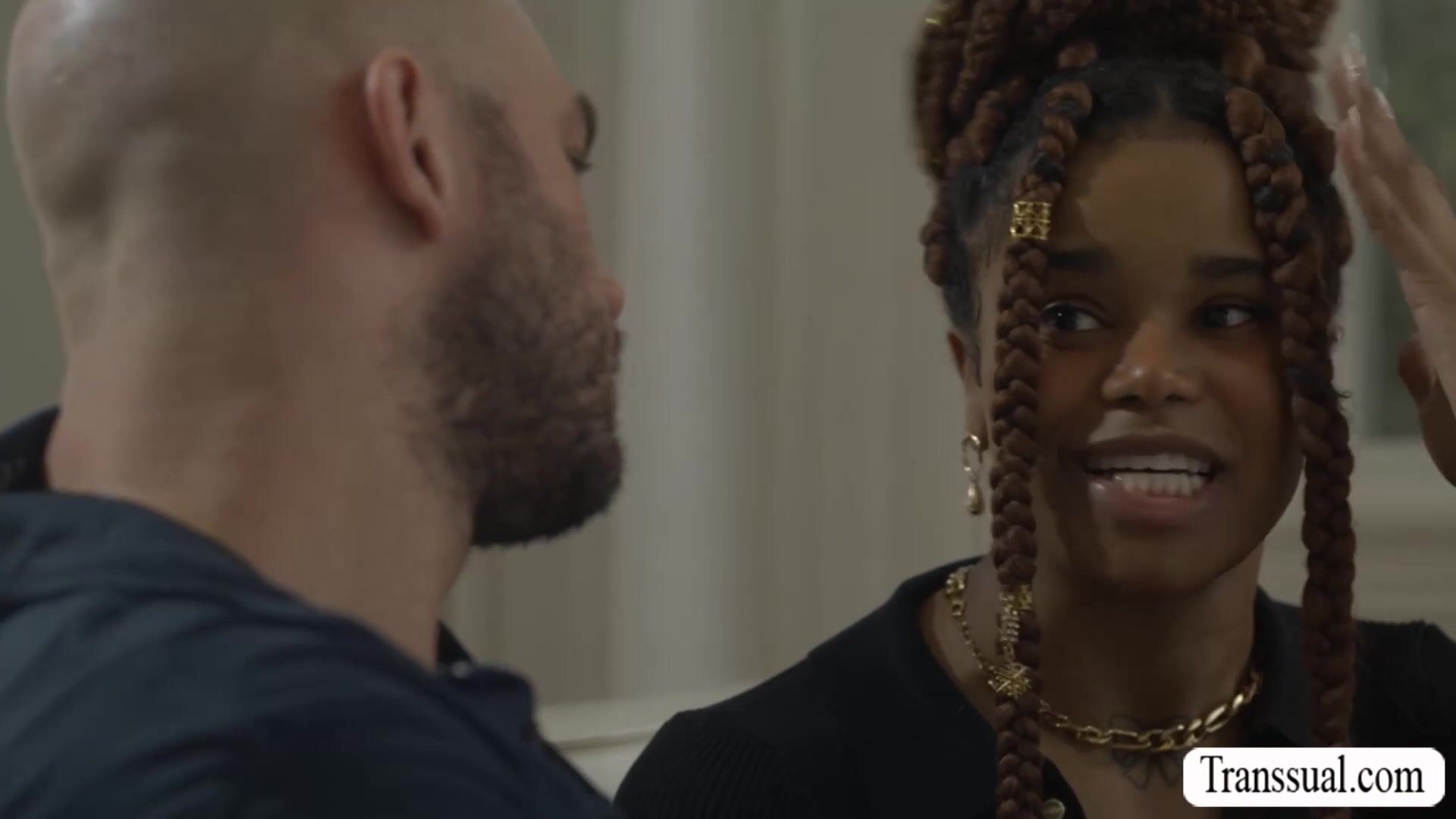 Busty Ebony Trans babe visits her boyfriend in his house and she then throat his hard big cock passionately.After that,she lets her boyfriend eat her ass first and bareback fuck it so deep and hard.Go to Transsual.com for the full video.