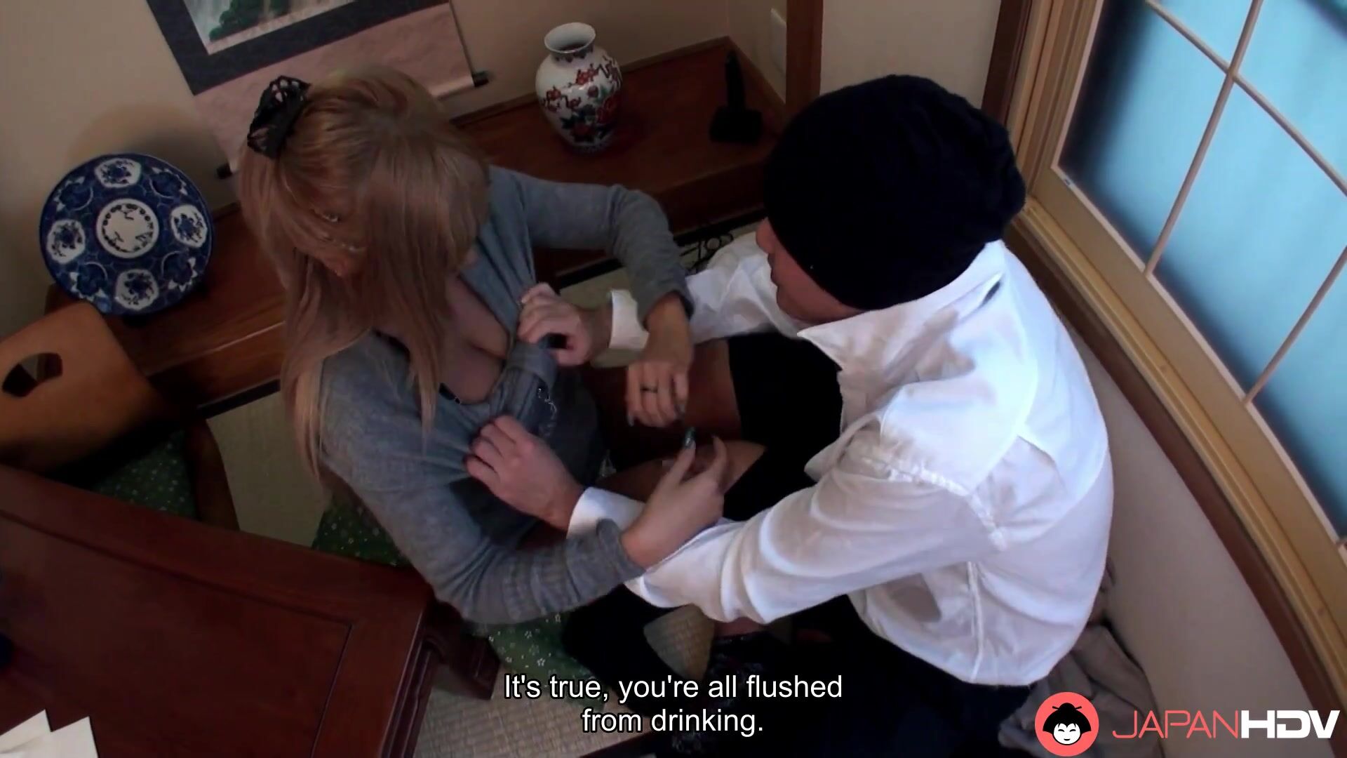 Runa tanned blonde Asian slut gets seduced into sucking and fucking a hard cock. He creampies her hairy pussy.