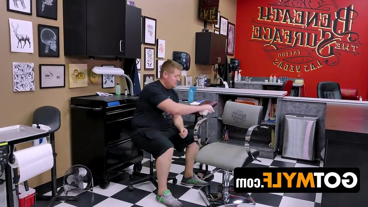 A mature, attractive woman possessing an ideal posterior captivates a younger man with an intense oral sex act within a body art parlor.