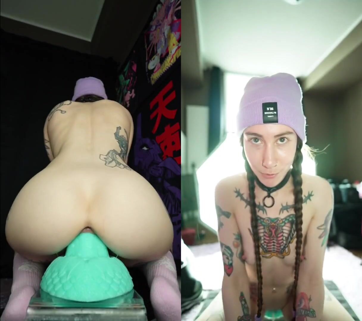 Huge standing dildo makes the inked girl riding it just ecstatic