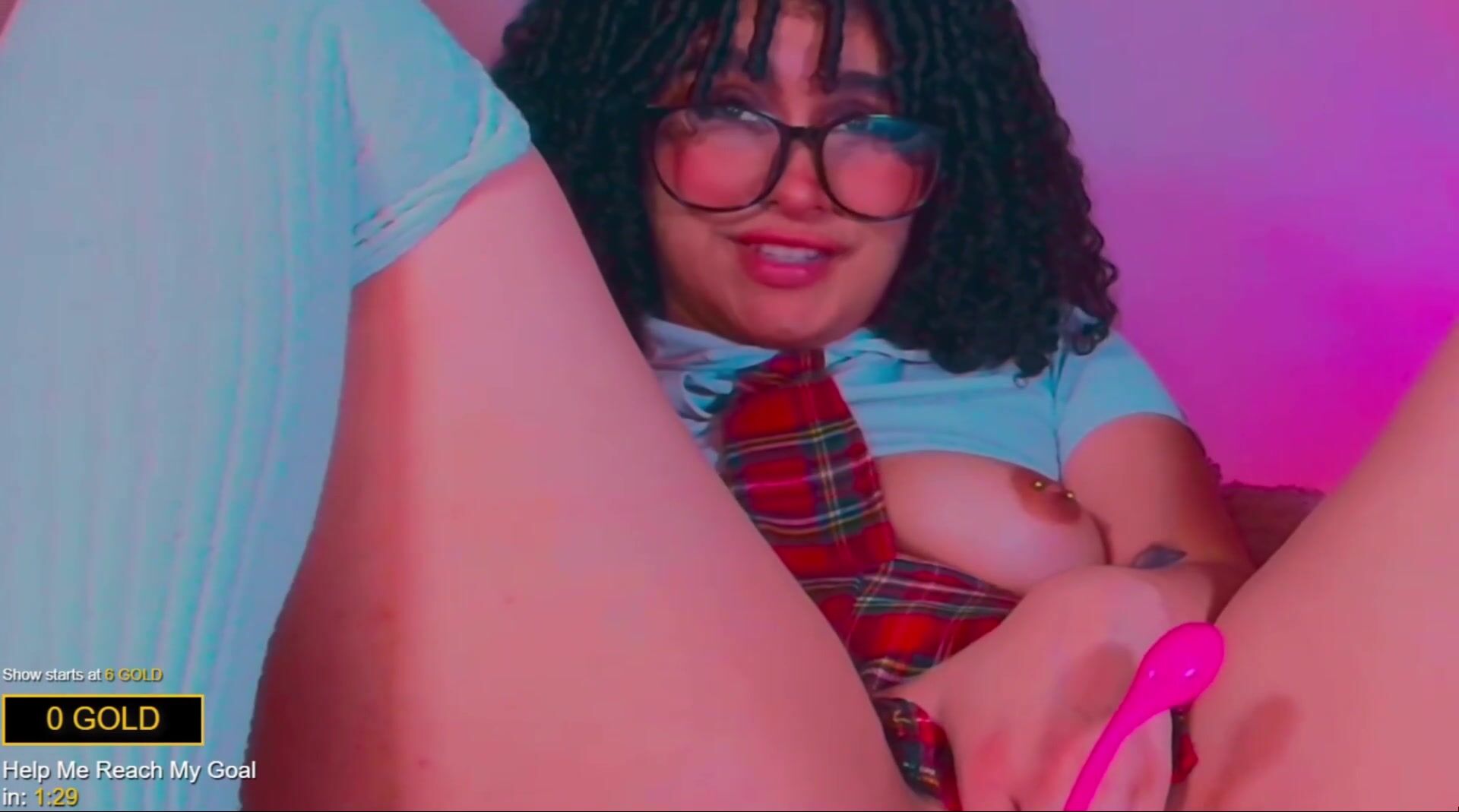 Latin curly babe in sexy glasses enjoys that you can control her toy. She has a wonderful smile, pierced nipples and banging body