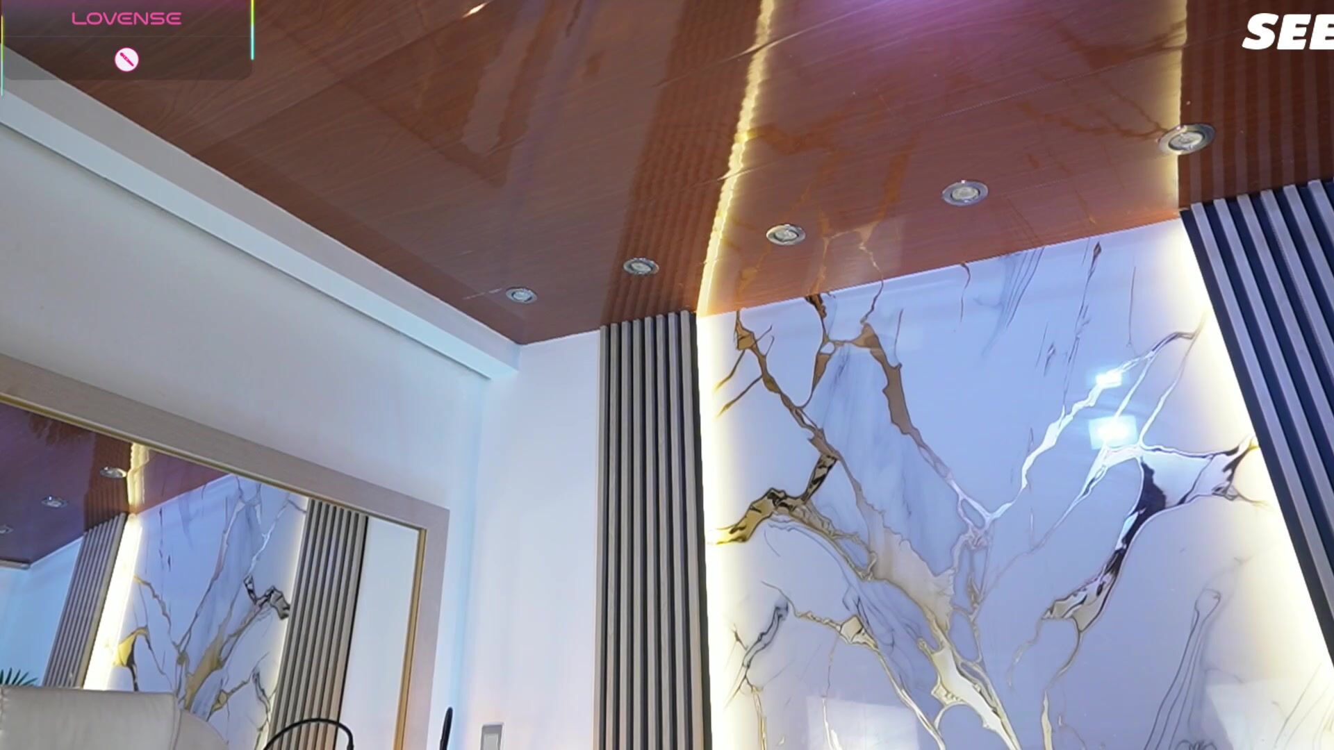Stunning Asian woman with long dark hair and curvy figure teases in a modern cam setup. She lounges nude on a gray couch, wearing black thigh-high boots, surrounded by toys and a desk. Spreads legs wide, grips a thick black dildo and thrusts it into her shaved pussy with passion. Facial expressions show building ecstasy as she fucks herself hard. Later scenes show her in luxurious marble room wearing red lingerie, dancing seductively. Pure solo masturbation action.