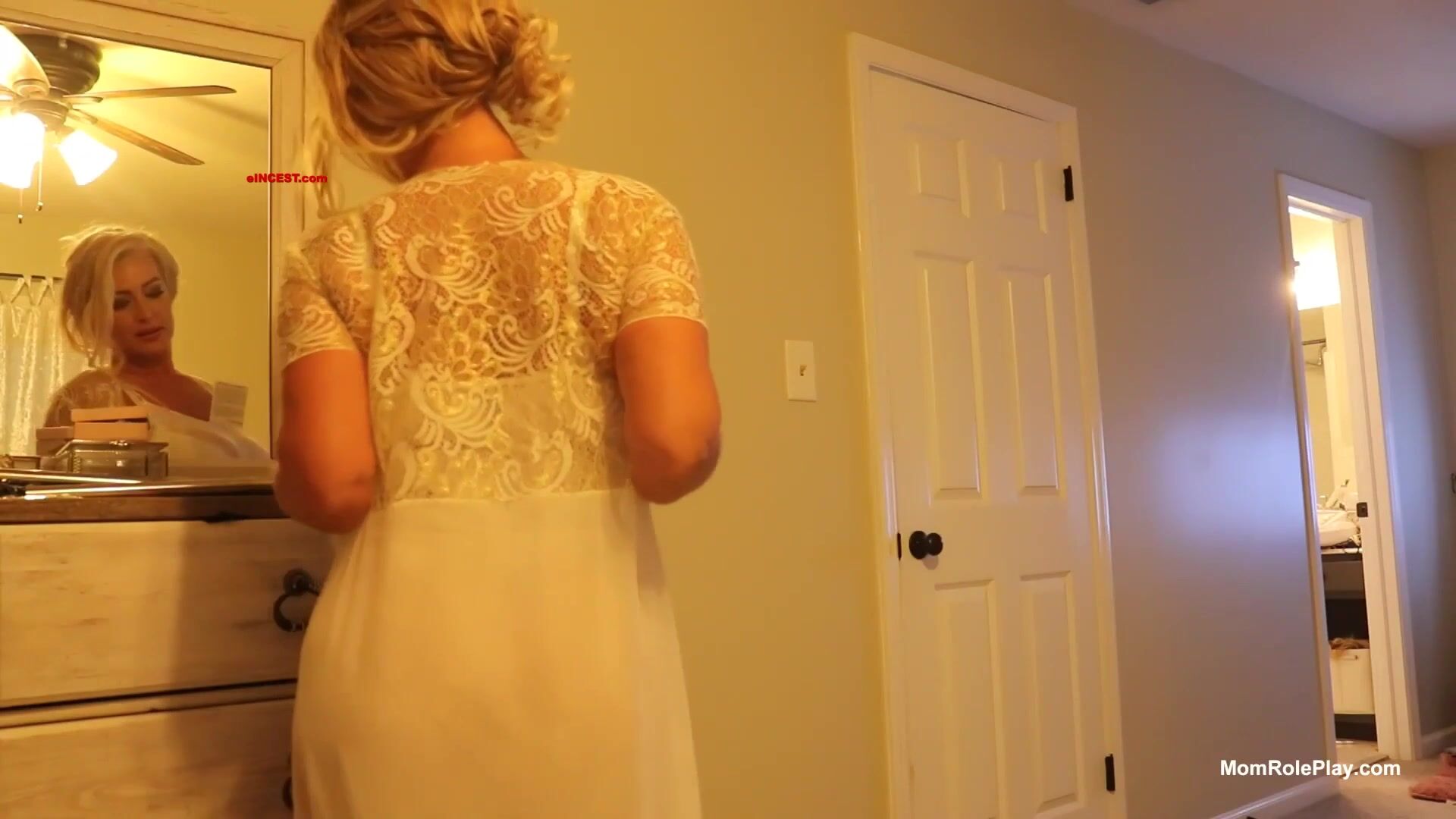 You wait in the room, as your stepmom comes in with just a towel after she showered. You ask her why her tits are so big and she starts to lotion them. Your stepmom knows you really like them, and will let you lotion them too. After a while you both get caught and dad is so angry she leaves your loving stepmom. In the next scene she starts wearing a wedding dress and ring. She slowly starts undressing, because she knows you are already hard as a rock, starts swinging her big beautiful tits in front of you, then gets down to her knees and starts sucking your cock (dildo). Your stepmom can’t take it anymore and wants to get fucked by you. You get ready to fuck her in missionary. She tells you to put her nipples in your mouth while you look at her to make her even wetter. You start thrusting in her, as she calls you a good boy. Scene ends with implied creampie.