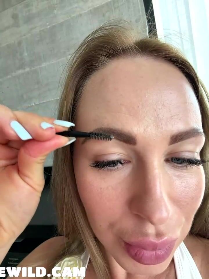 A gorgeous blonde beauty with long hair and voluptuous figure flaunts her assets in a daring white cut-out lingerie outfit adorned with flowers and beads. She strikes playful poses by the table, squeezes her ample cleavage, twerks her hips, and carefully does her makeup using a mirror near the kitchen area with curtains and plants in view.