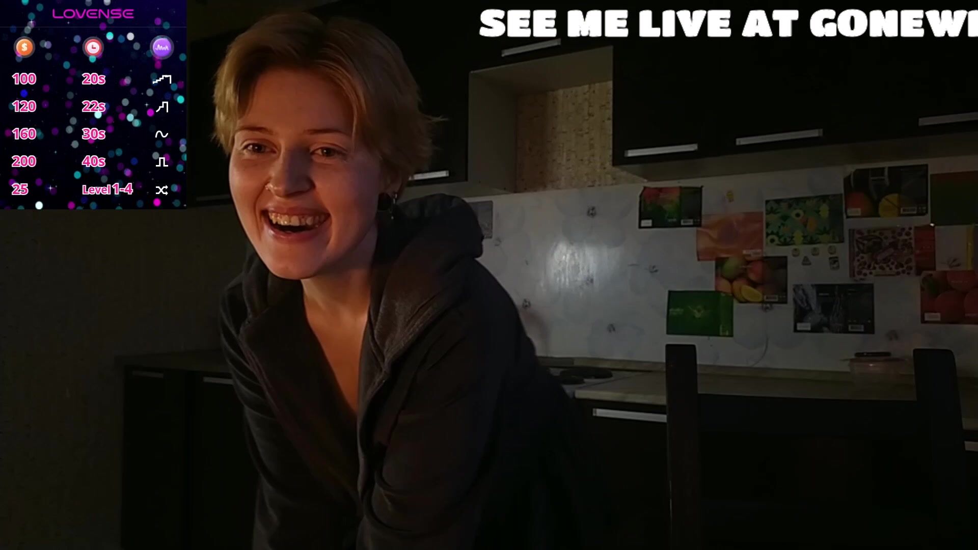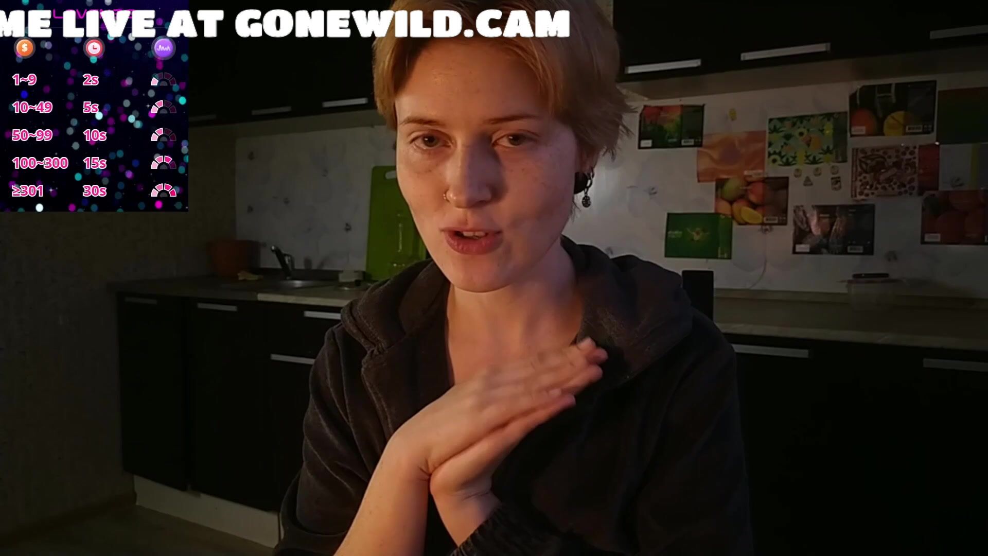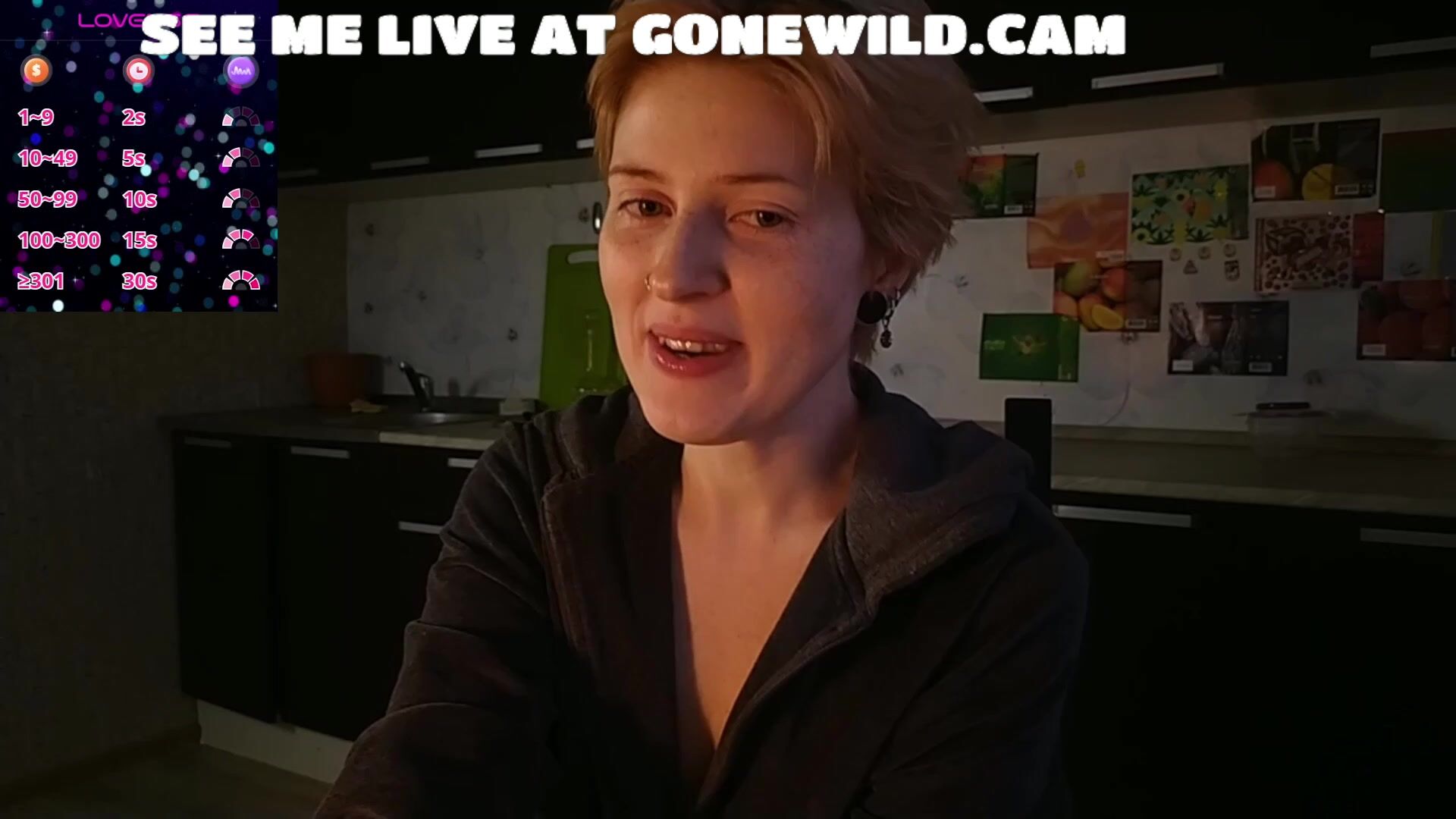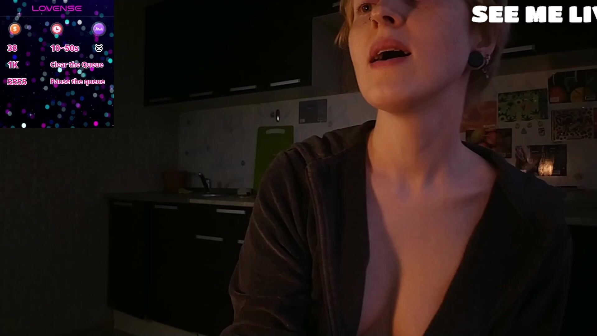 Watch this adorable blonde girlfriend in a dimly lit kitchen, wearing glasses and a cozy black hoodie. She chats playfully, holds a red mug, and slowly parts her hoodie to reveal her full, natural breasts. Smiling seductively, she poses with hands framing her chest, building tease in this intimate webcam clip.