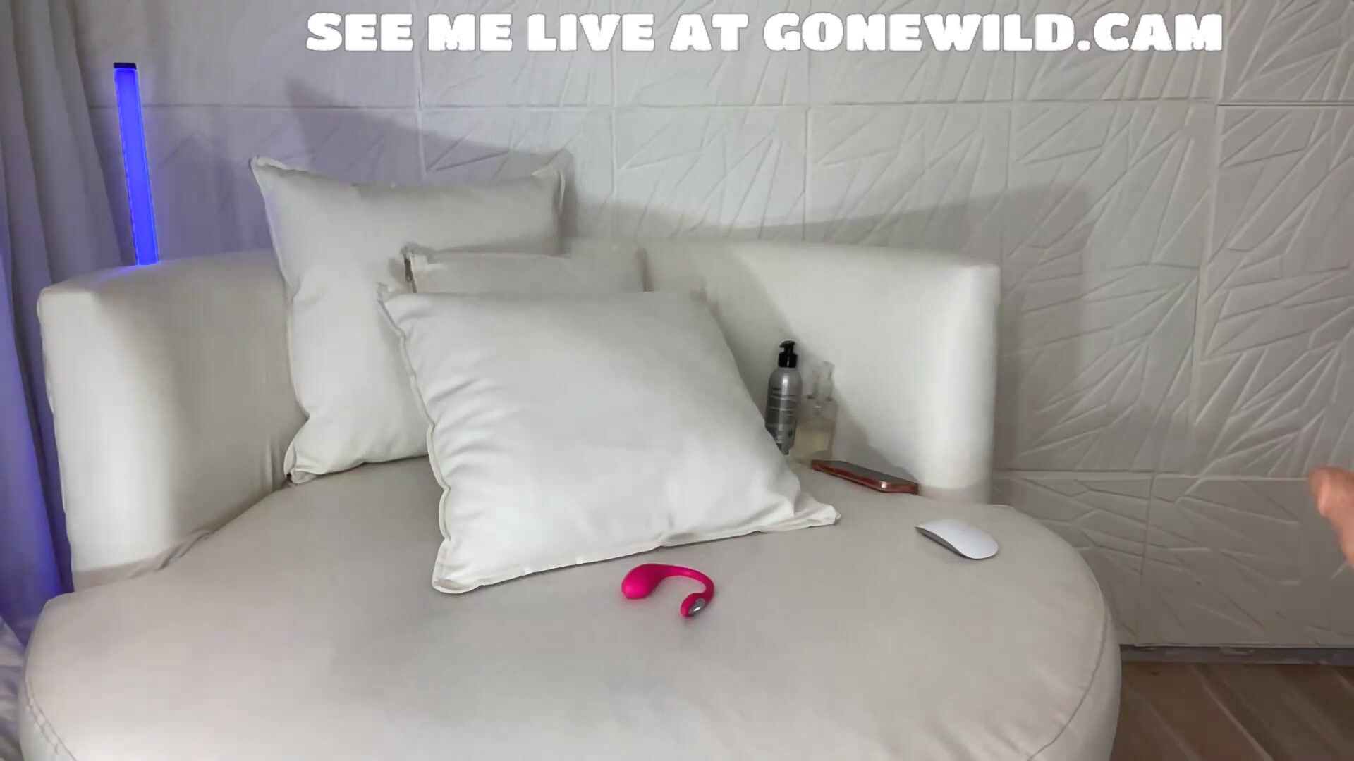 Glamorous blonde in sexy glasses and red lace lingerie lounges on plush white couch. She teases with sultry poses, garters, spreads legs wide, fingers pussy and uses pink dildo. Close-ups of her bare soles, big tits and intense pleasure in luxurious bedroom cam session.