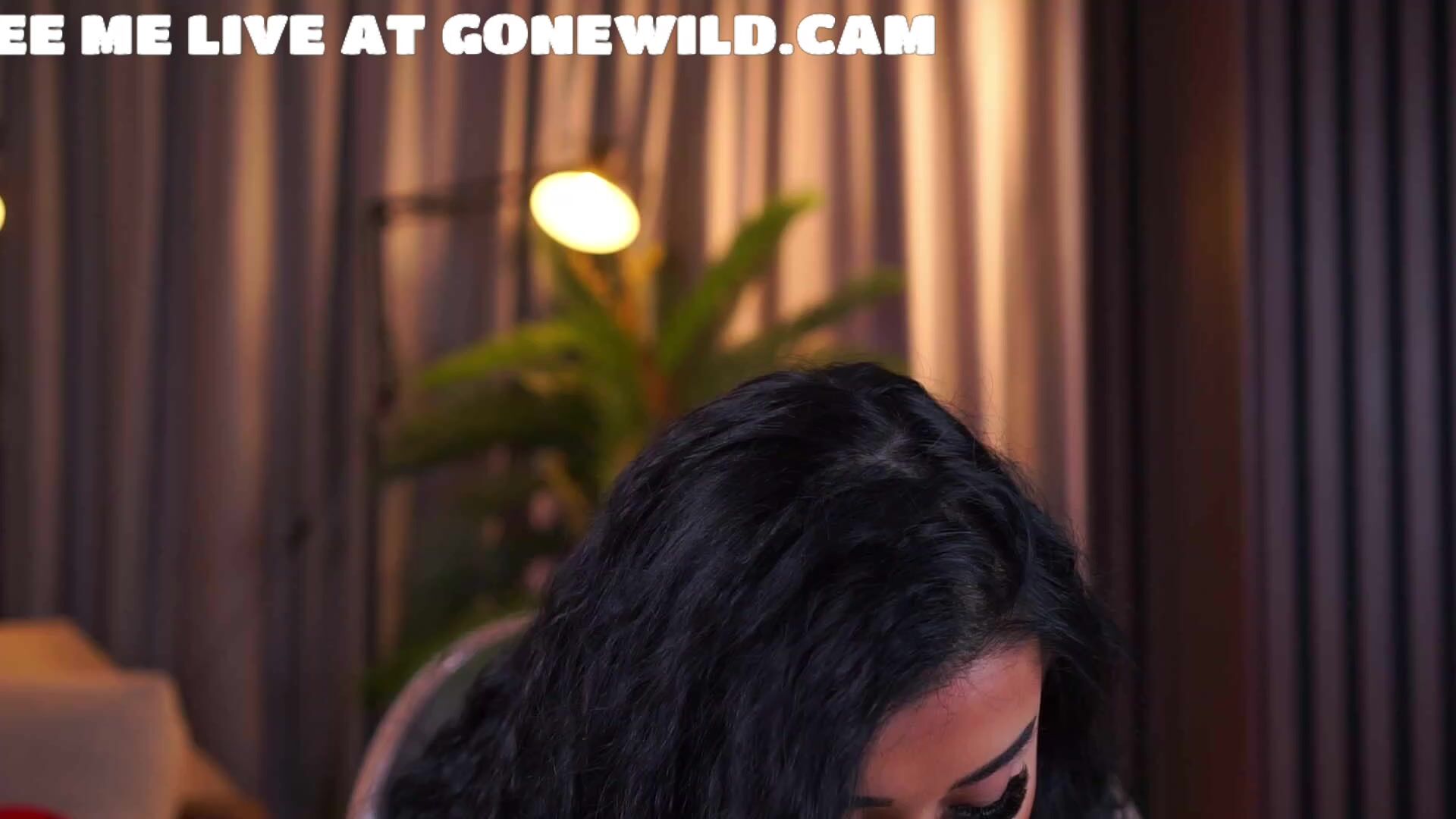 Exotic brunette with long wavy black hair, full pouty lips, heavy tattoos on arms, and voluptuous figure teases sensually in sheer black lace bodysuit. She flaunts her big breasts, grips her crotch, poses provocatively on the bed near red pillows, with warm lamp light, curtains, plant, and cozy room setting.