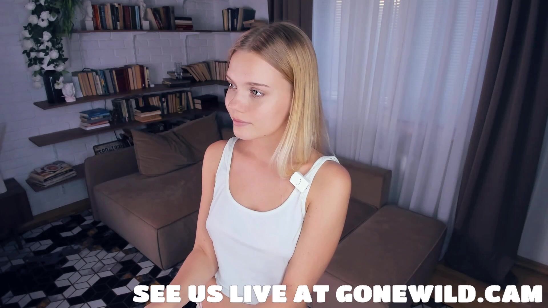 Watch this gorgeous blonde beauty teasing in a modern living room surrounded by bookshelves, plants, and comfy couches. Dressed in a tight white tank top and tiny denim shorts, she strikes playful poses—turning around, flexing her arms, smiling at the camera, and highlighting her toned abs and curves in a flirty webcam-style show.