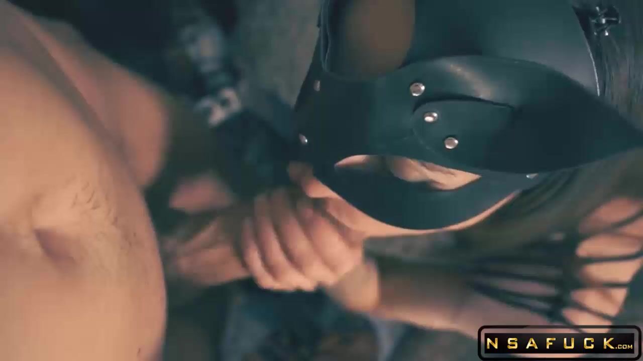 Stunning brunette with tattoos wears cat mask, black lace top, and leopard print tights. Poses seductively on plush gray couch, spreading legs and showing off curves. Man joins for face-fucking session - she eagerly sucks, licks, and deepthroats his thick cock from multiple angles. Fetish outfit, we