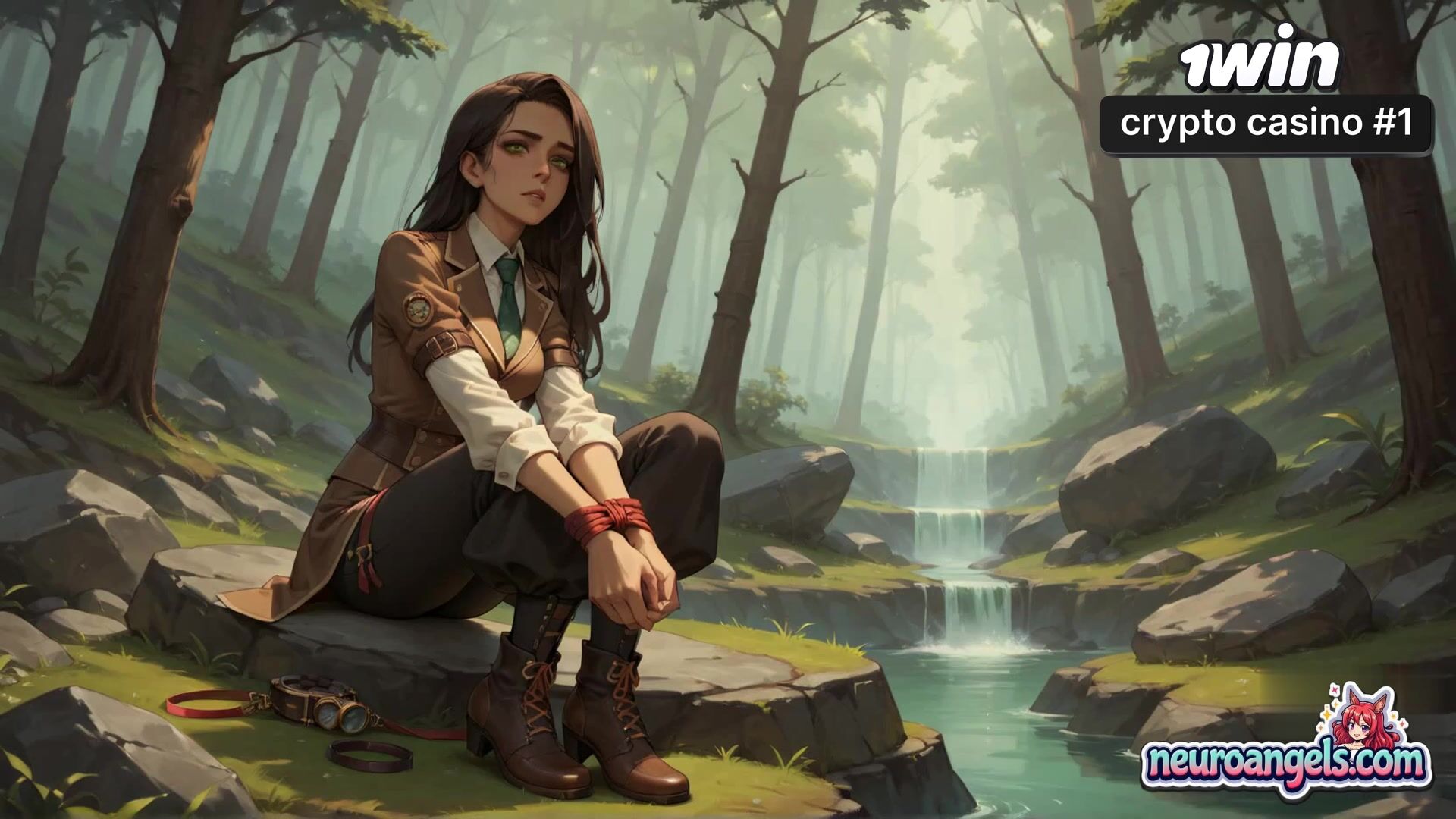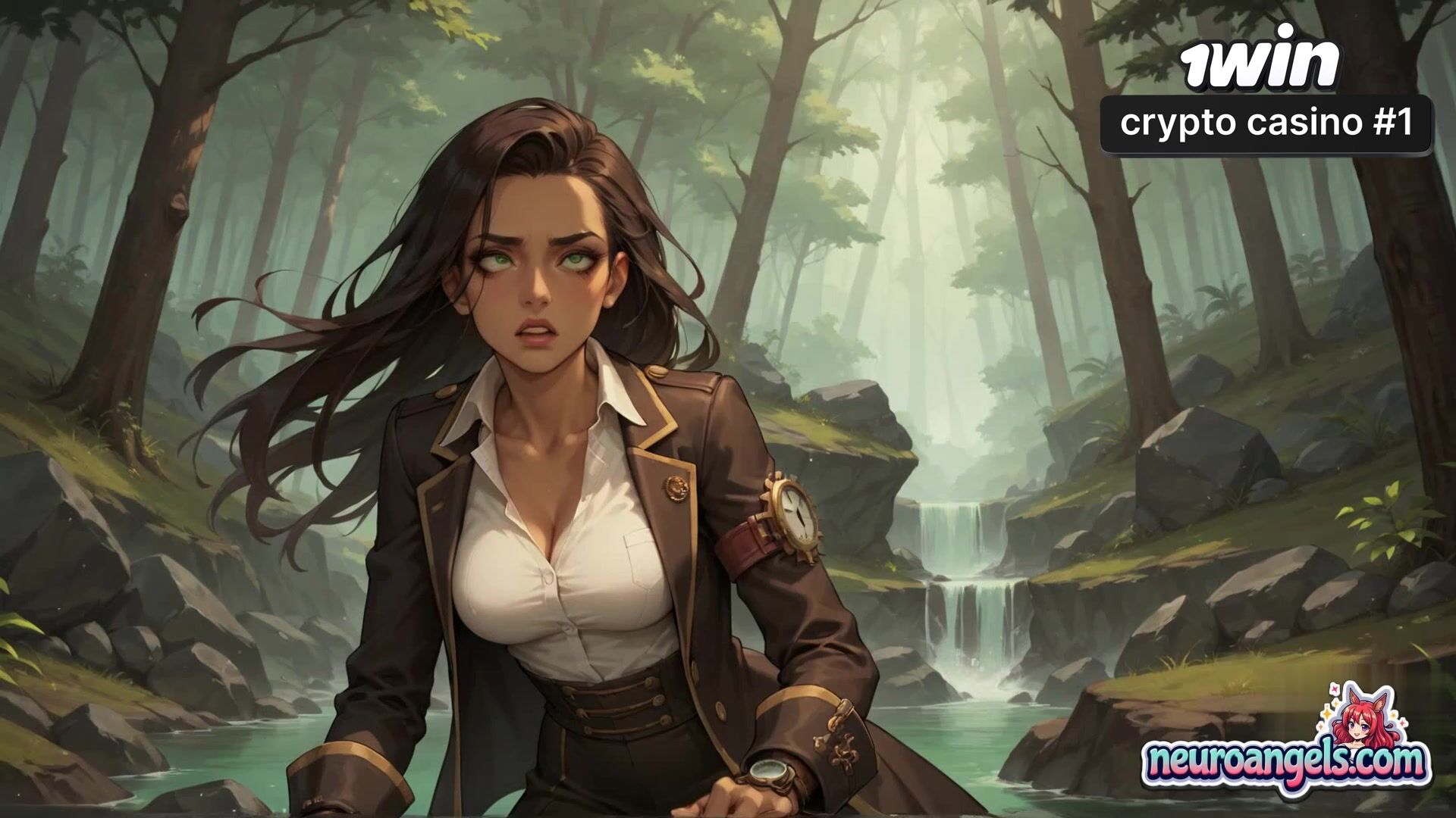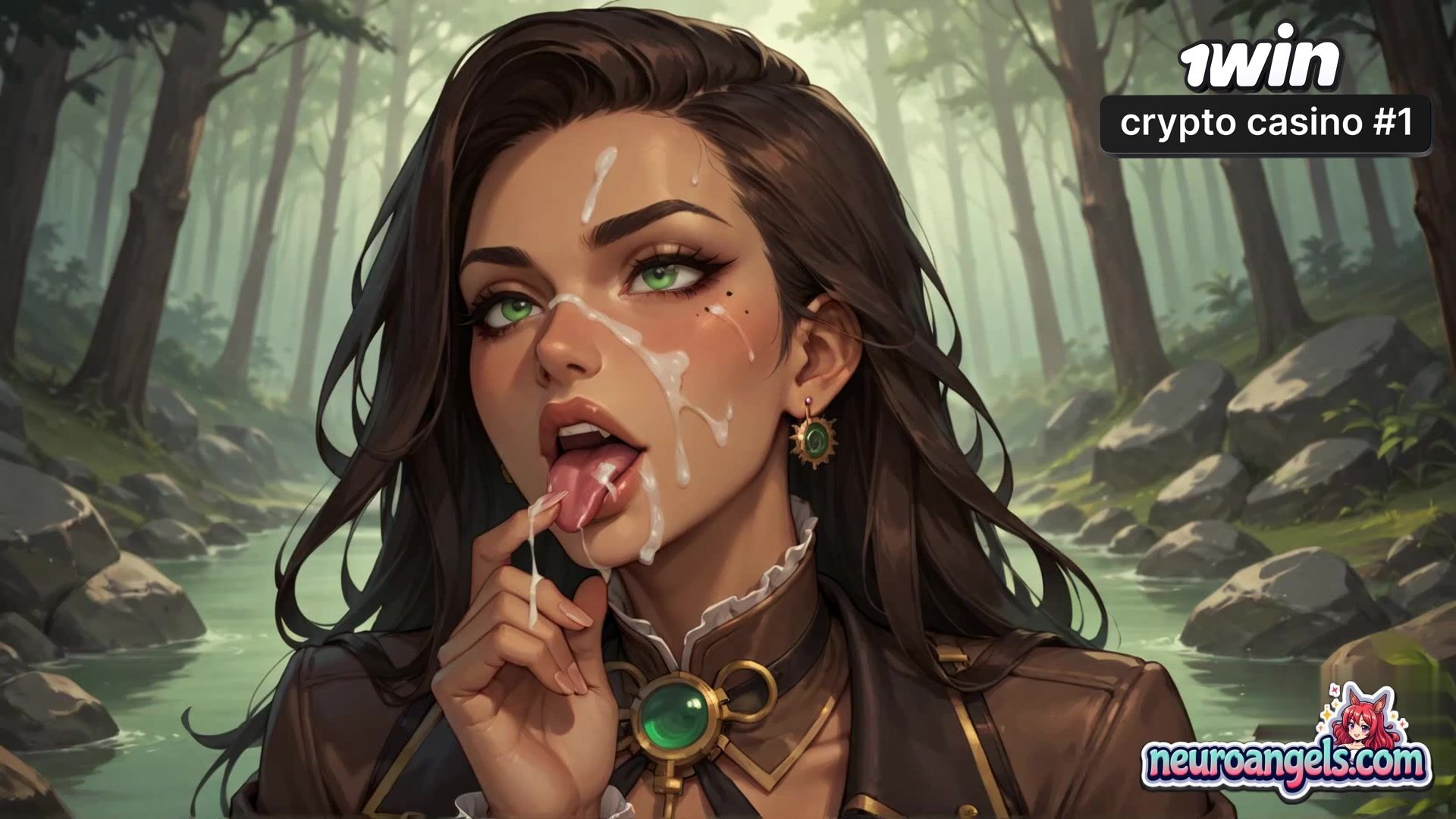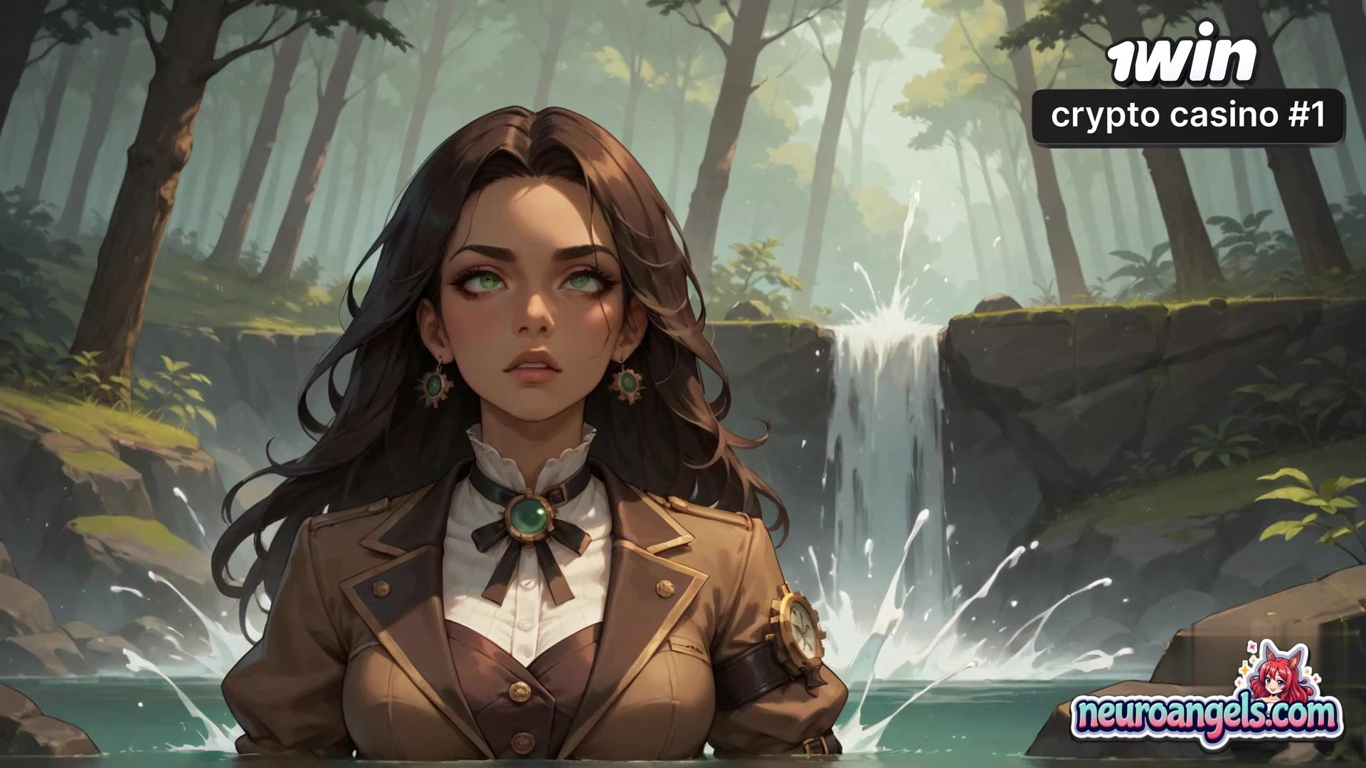 The serene waterfall backdrop amplifies her sensual release