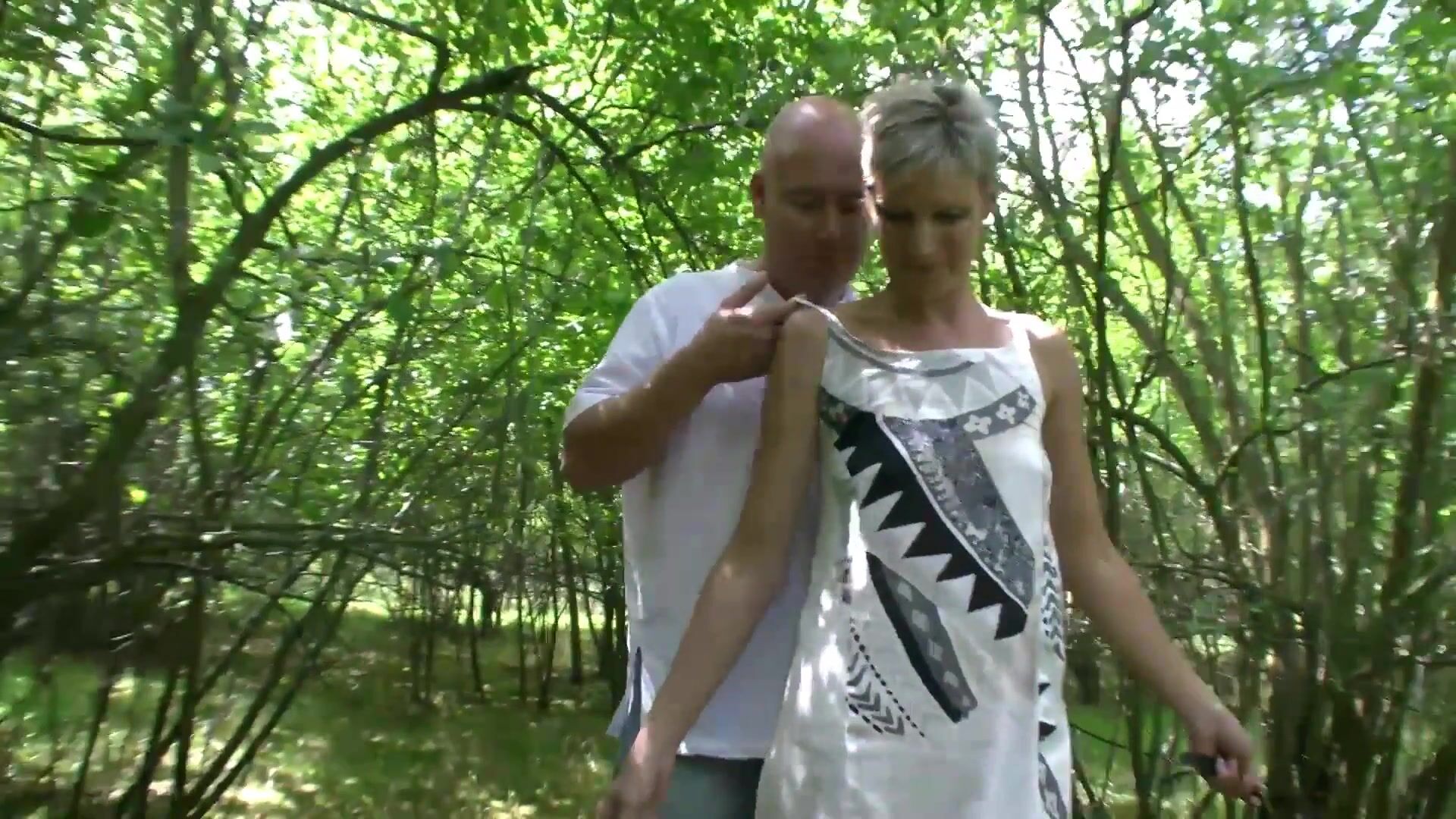 Fair-haired, mature female is pleasured sexually in an open-air setting.