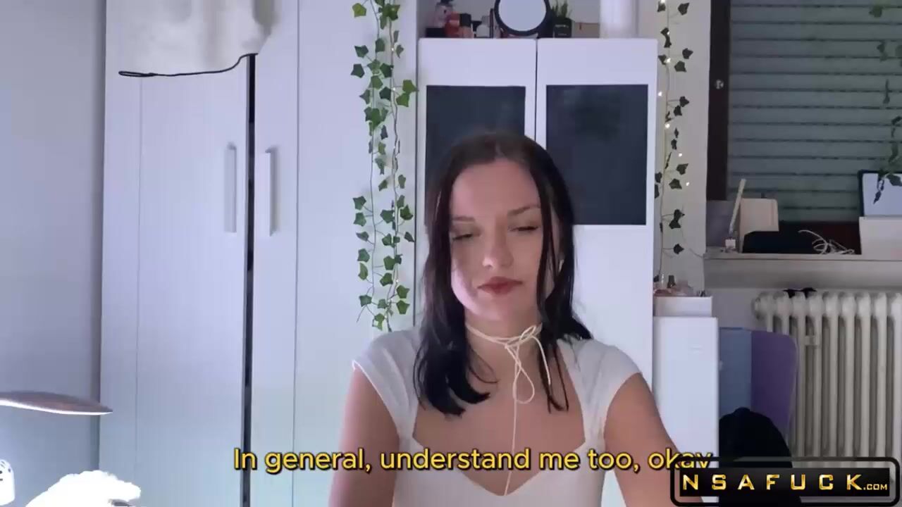 Stunning brunette with dark hair poses seductively by fridge in tight white top, then kneels to kiss a cock intimately. Man with tattoos fingers her wet pussy on bed as she spreads wide in lingerie. Intense action escalates to doggystyle pounding, ass bouncing with visible penetration.