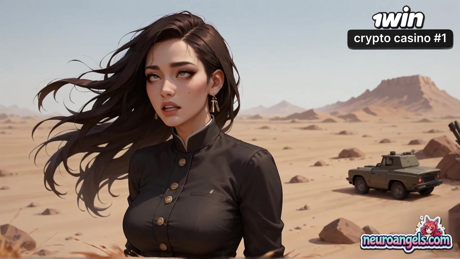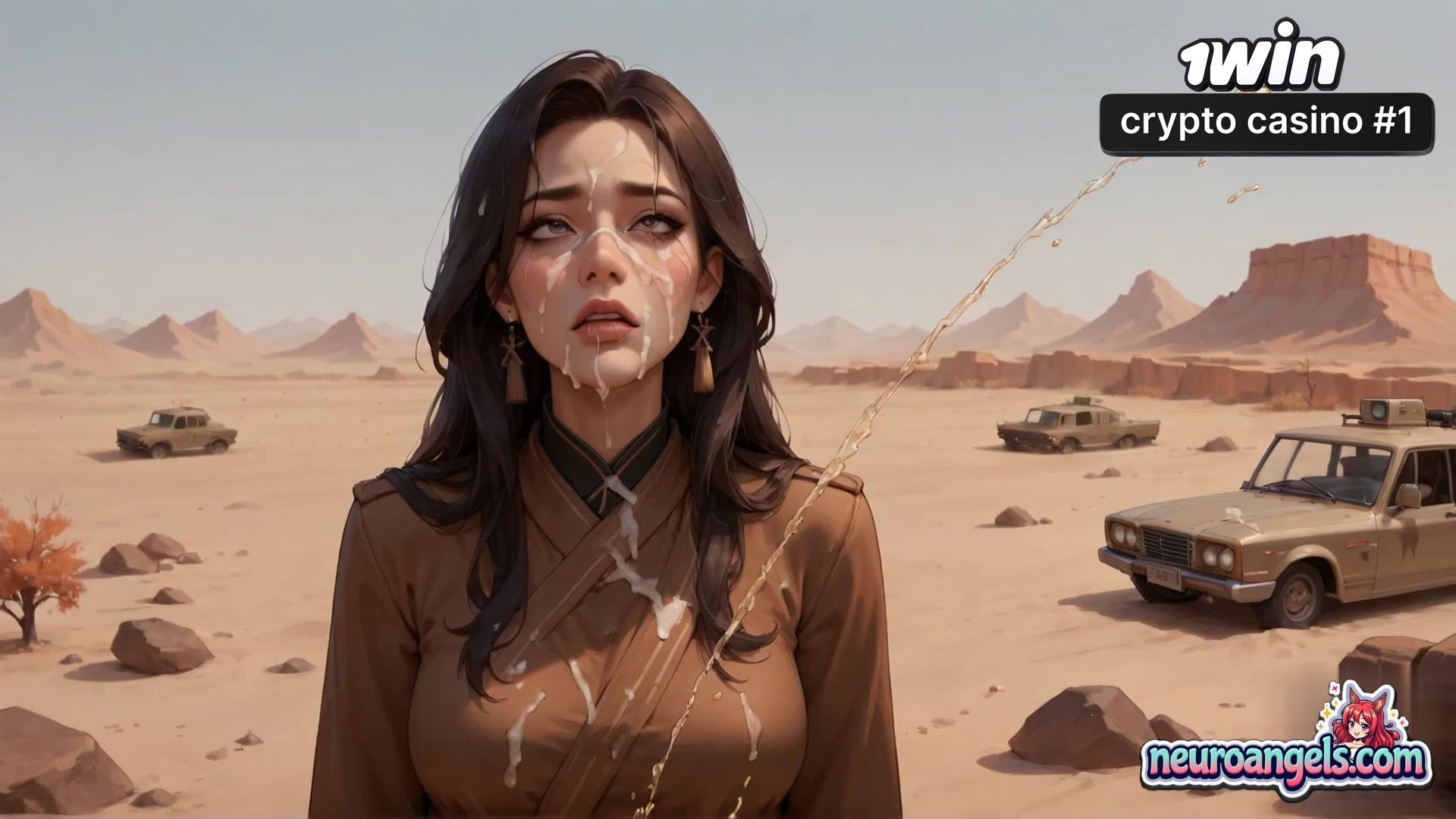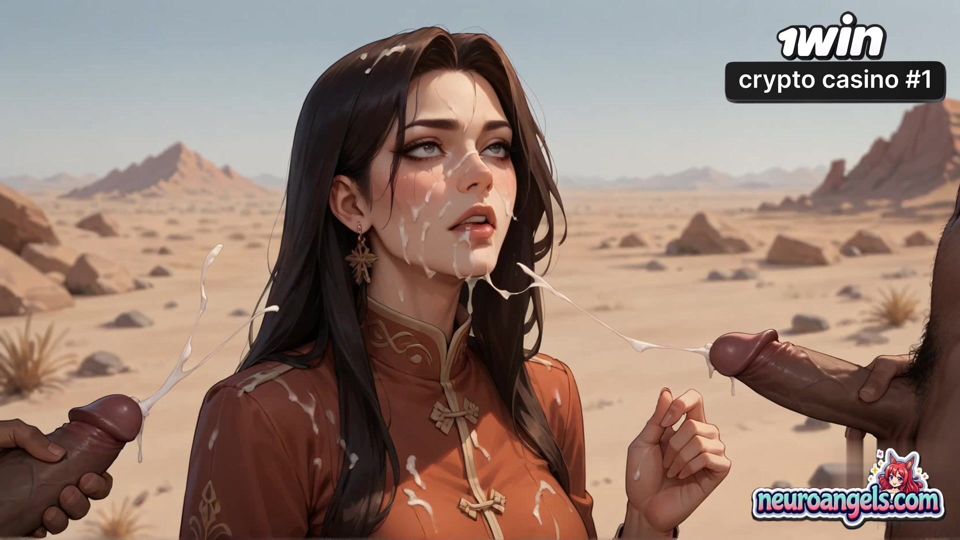 A girl stands in the vast desert landscape as multiple hands shove fake penises toward her, creating explosive sprays of liquid.