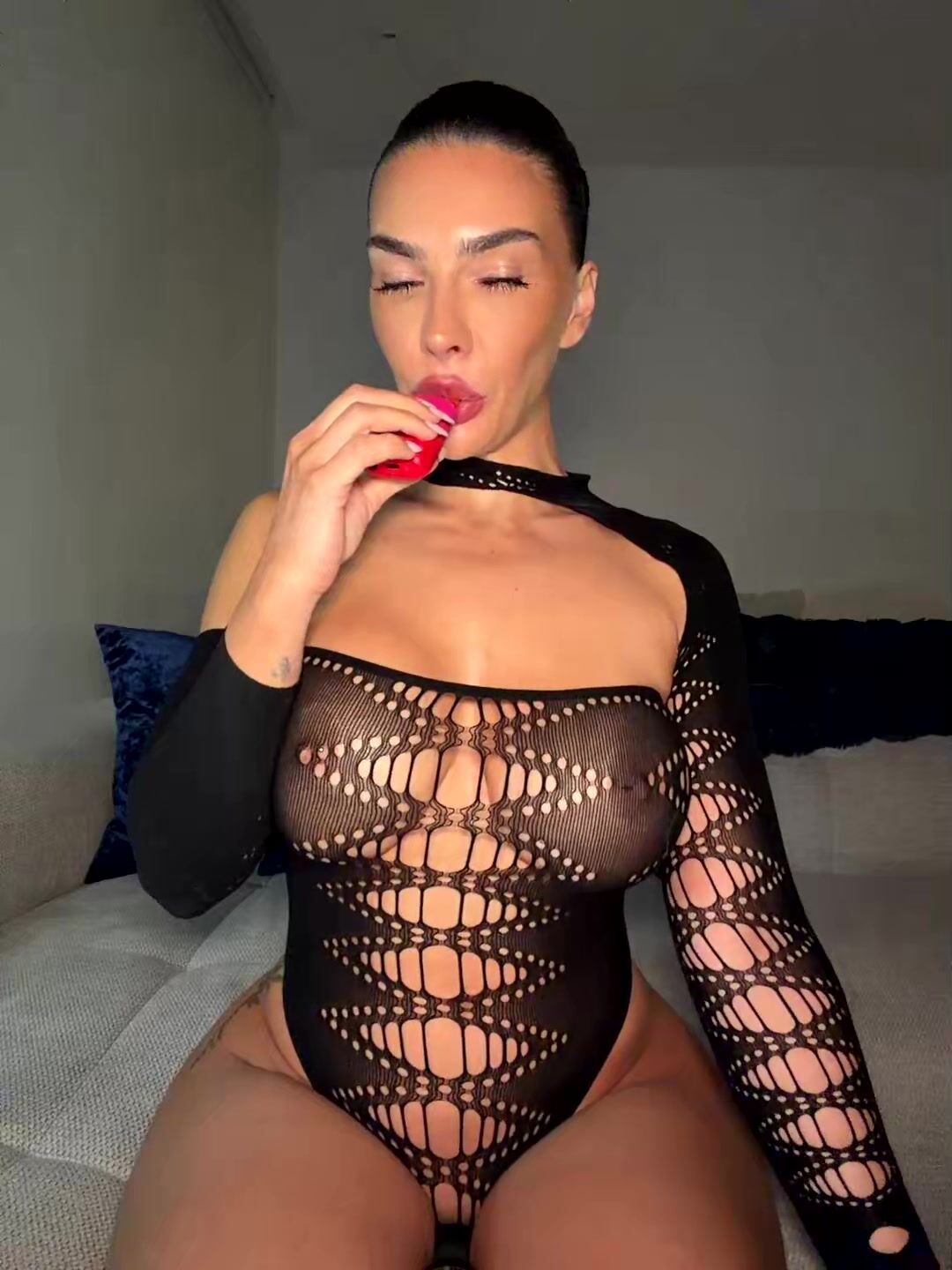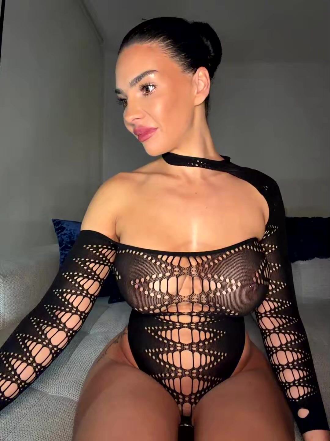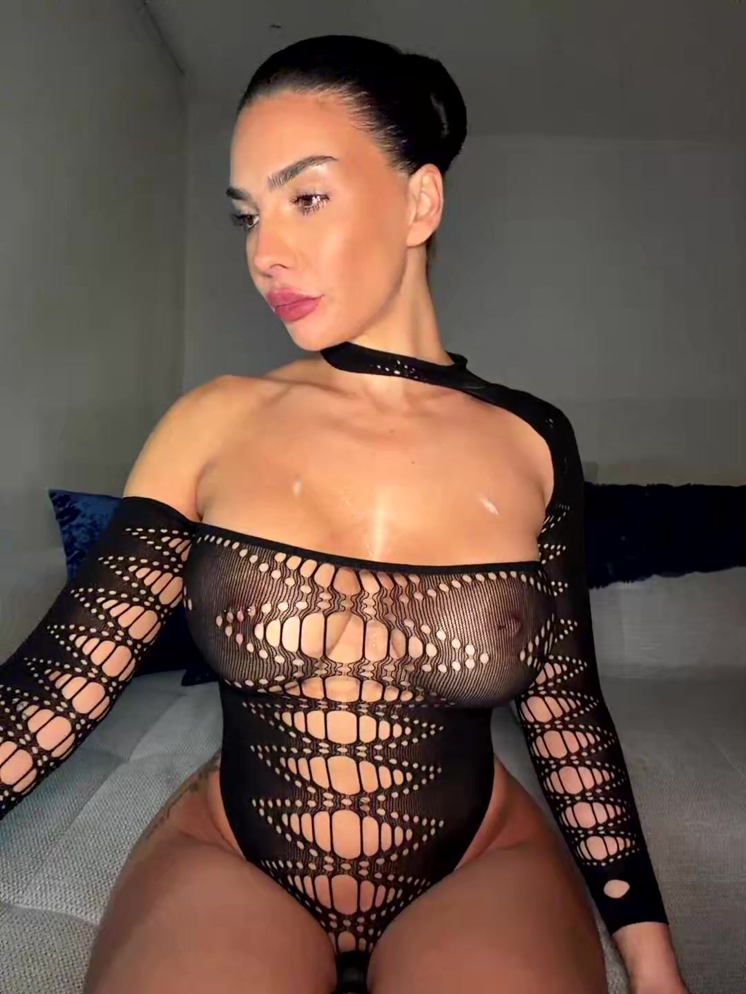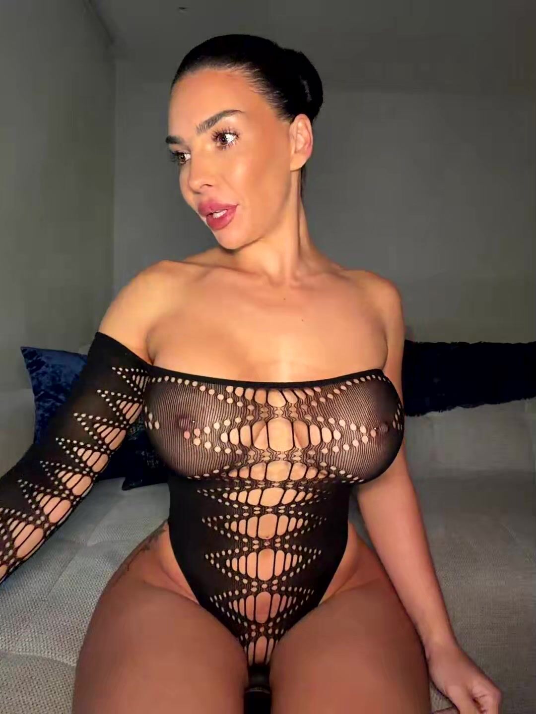 Gorgeous mixed-race woman with short hair and exotic features lounges on luxurious bed. She flaunts her voluptuous curves in intricate black lace bodysuit that barely covers her big tits and thick ass. Poses provocatively, then removes it to reveal perky nipples and shaved pussy. Spreads legs wide, inserts and vibes Magic Wand vibrator deep inside, moaning in pleasure. Intimate close-ups of her wet folds and intense solo masturbation session.