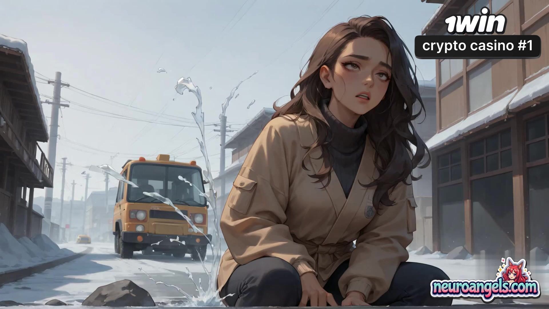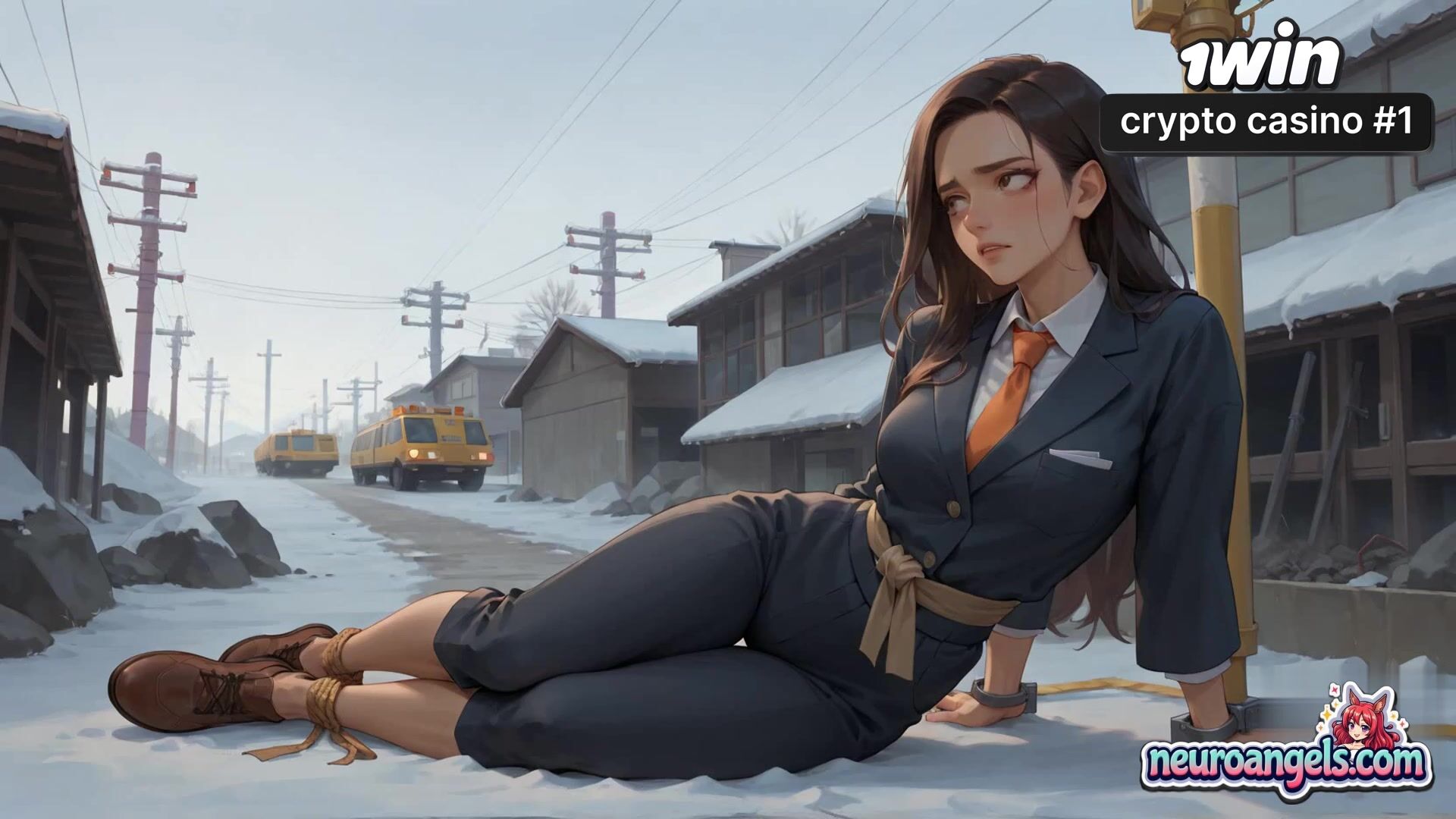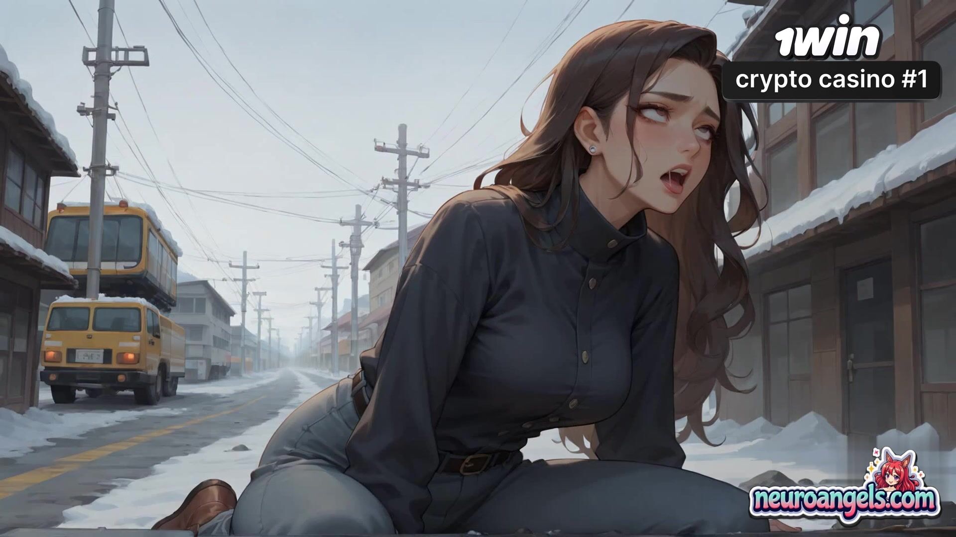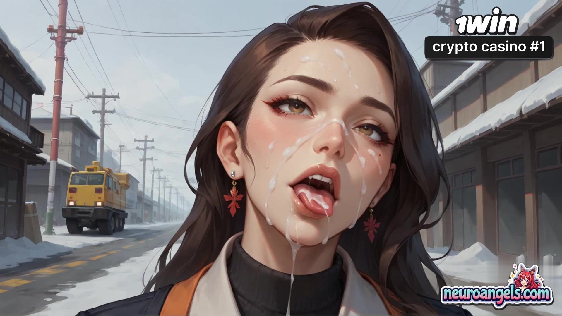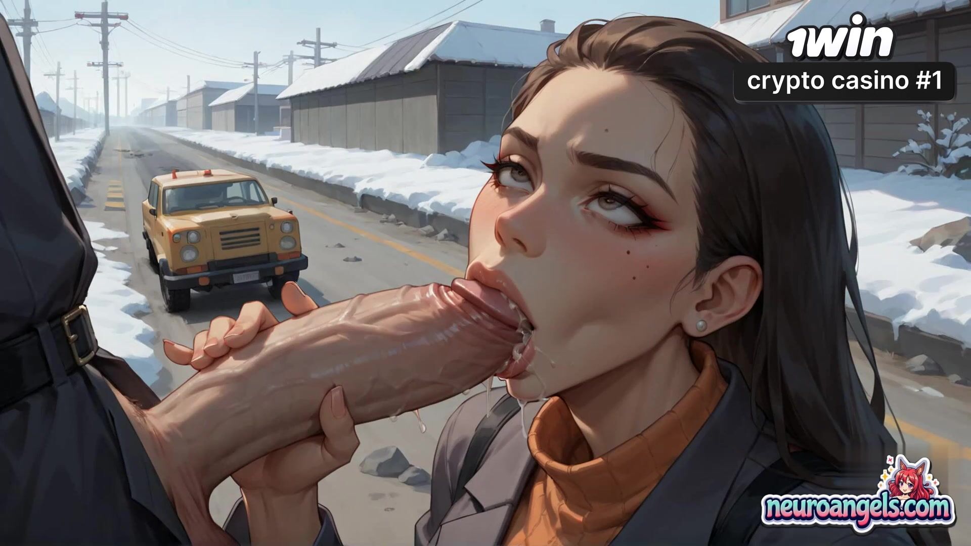 A voluptuous lady lies sprawled on a snowy roadside, her bod glistening with large white liquid as she's forced to suffer numerous milking sessions.