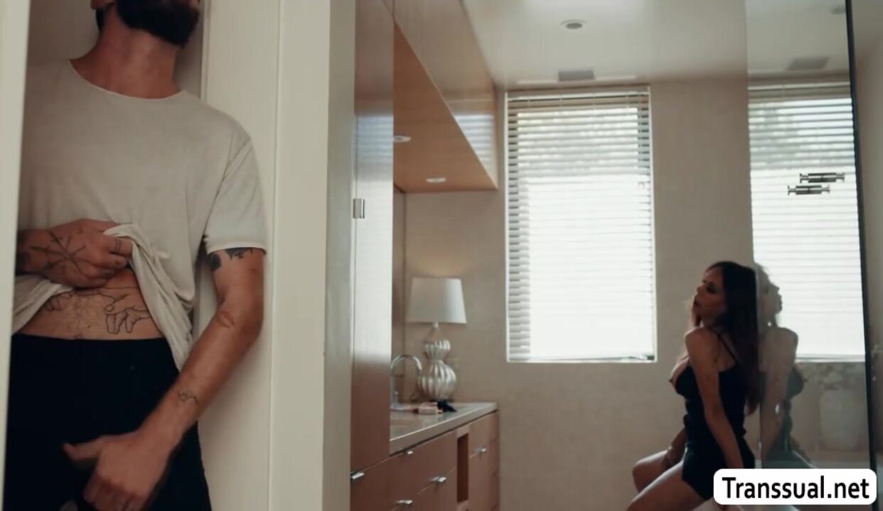 Horny stepson watches his shemale stepmom masturbating in the bathroom.After that,he pulls out his dick and jerks it too.Next is,he goes inside and lets his TS stepmom suck his hard cock and he then bareback her ass in return.
