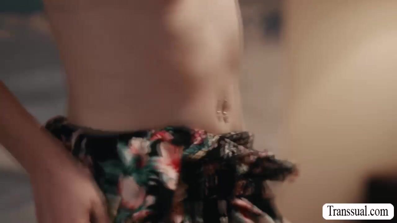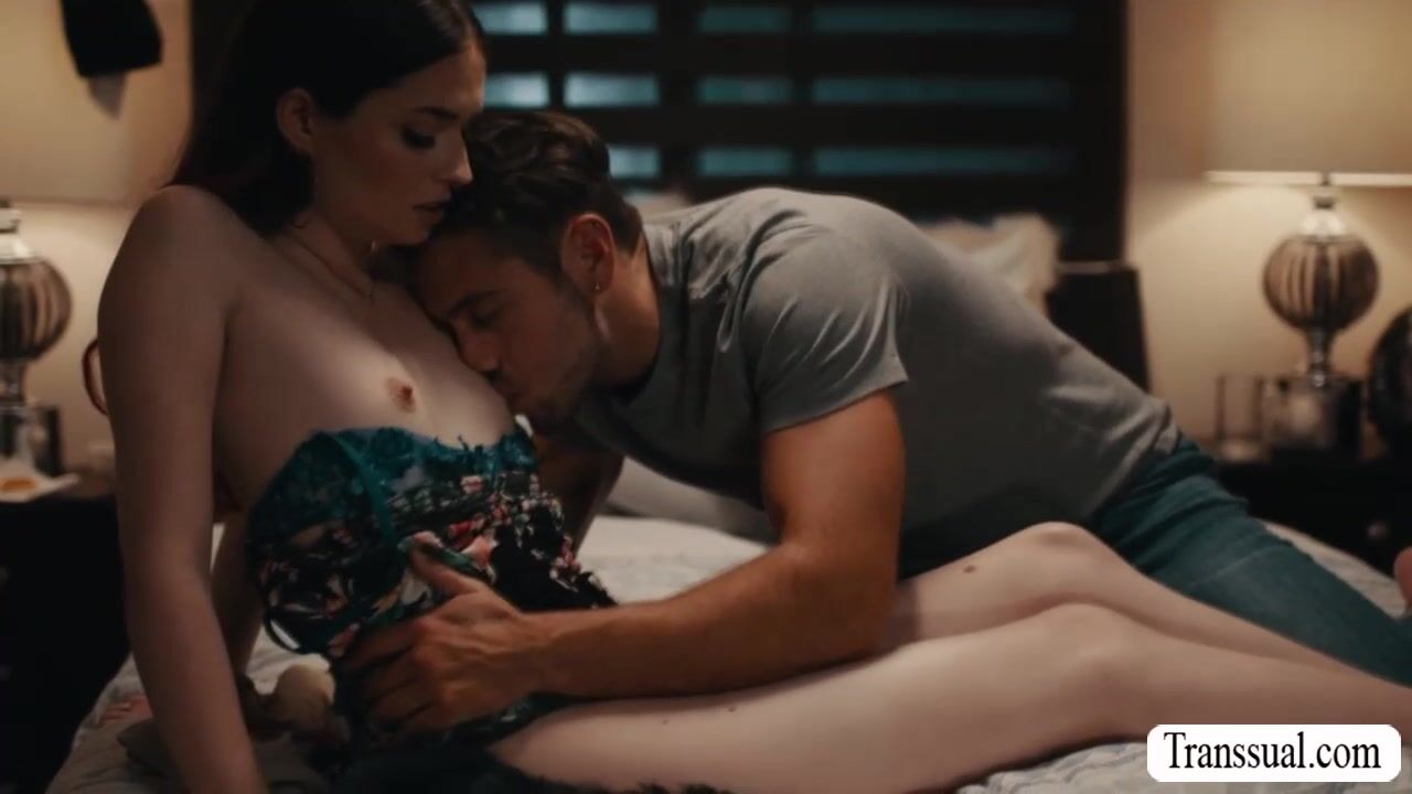 Slut shemale goes to the room of her stepbrother and talks about something.After that,they get horny and start kissing each other on the bed.Next is,she throats his hard big cock passionately and lets him bareback her wet tight ass so hard.